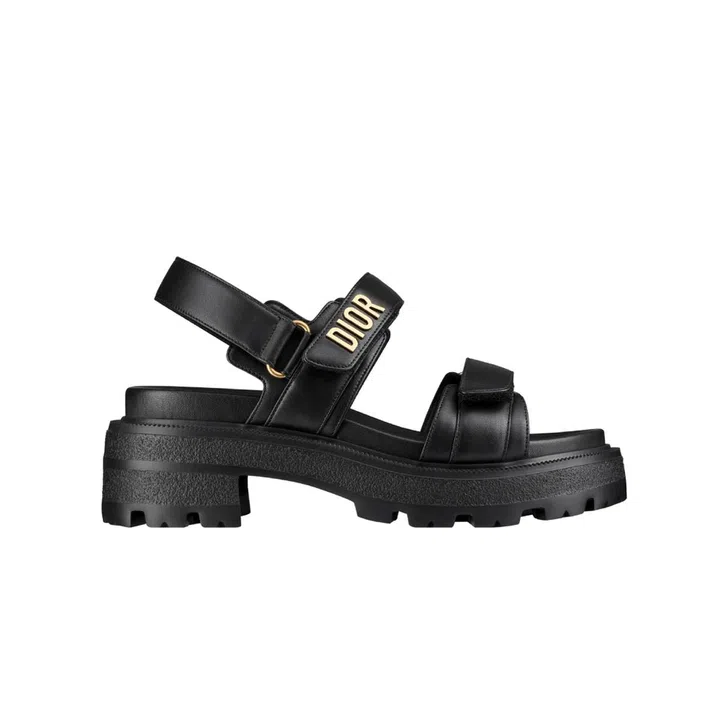 These kicks are a lightweight platform crafted from black lambskin. The shoe features self-fastening straps embellished with a gold-finish metal Dior signature on the upper strap.