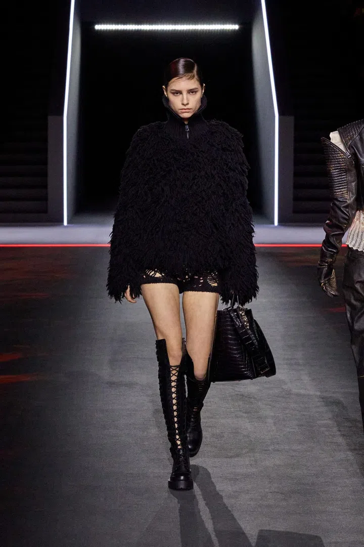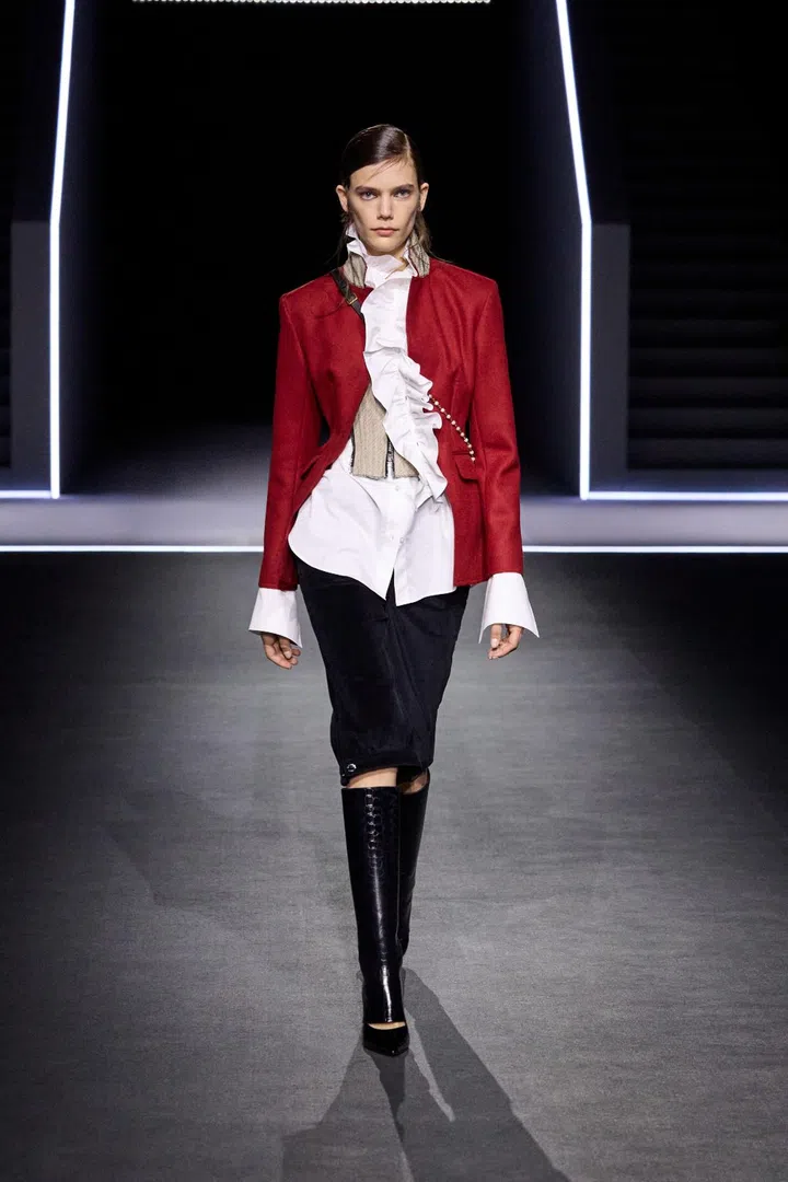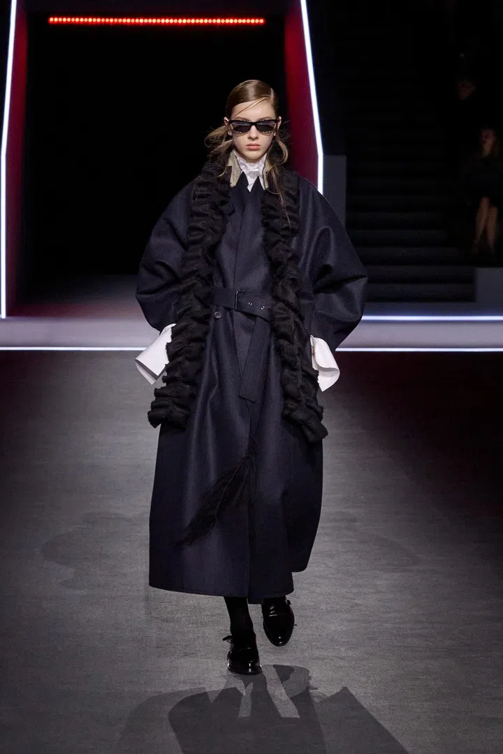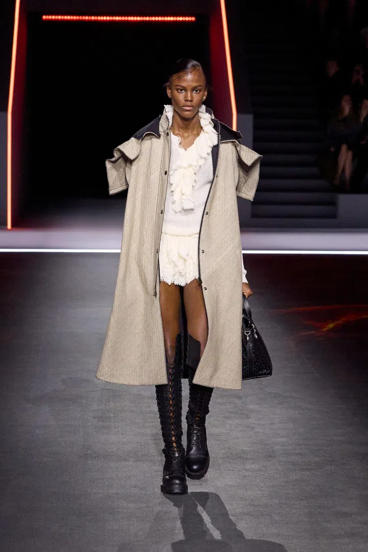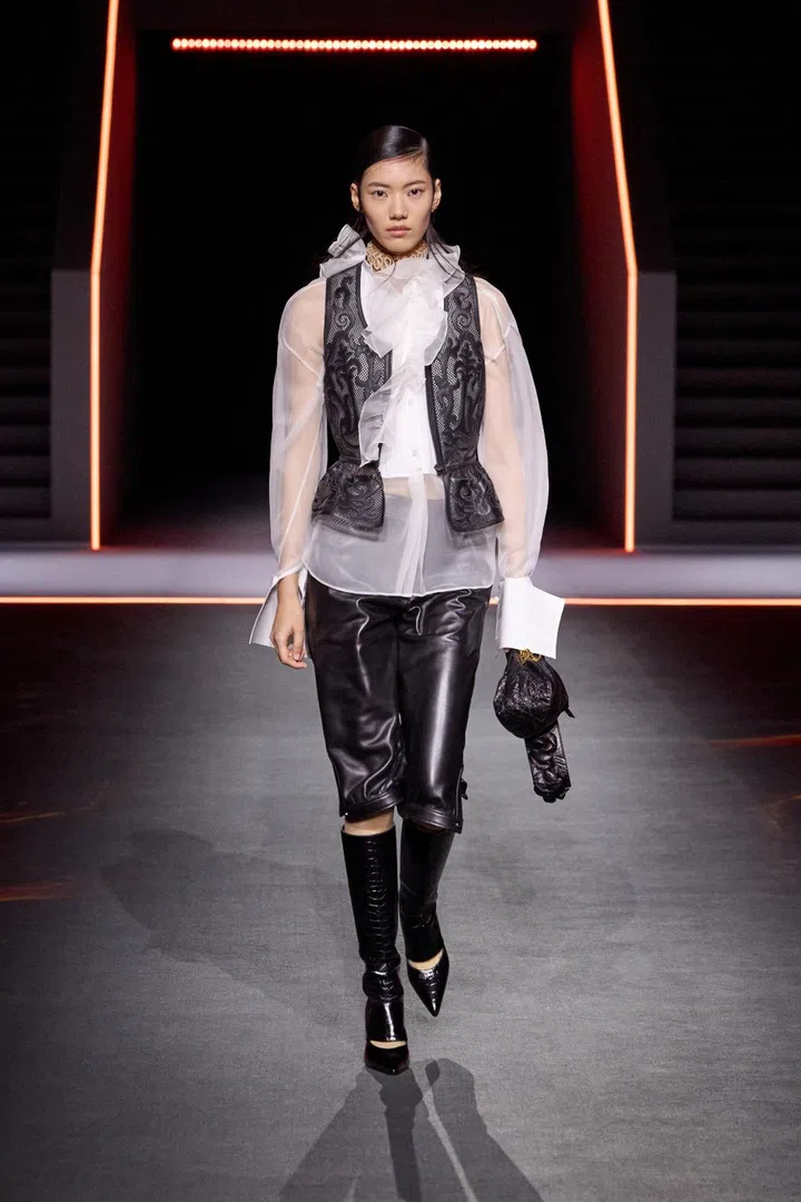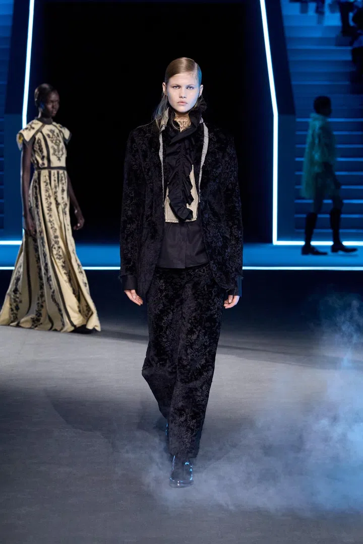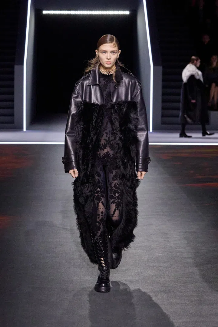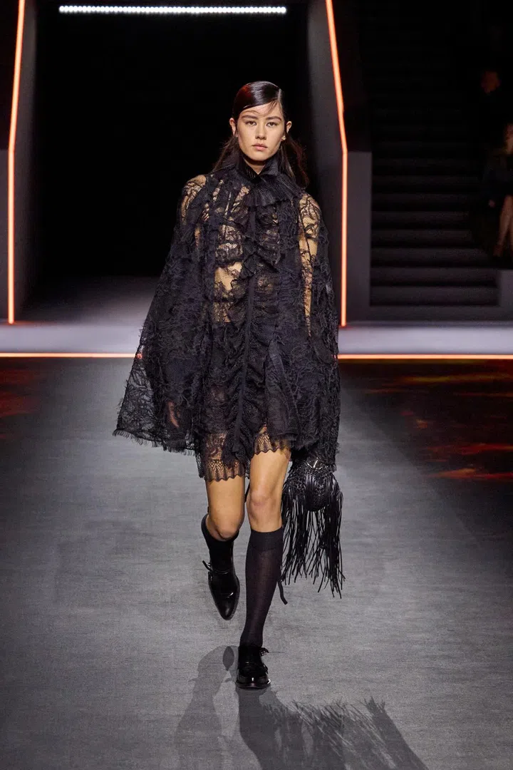 Maria Grazia Chiuri’s real strength this season lay in her ability to turn practical outerwear — raincoats and parkas — into elevated, luxurious pieces. She achieved this through hazy, antique-inspired prints applied to riding coats and denim suits. Chiuri also played with material expectations, where fabrics that looked heavy and bulky were surprisingly lightweight, and dresses that resembled delicate lace were actually crafted from knits.