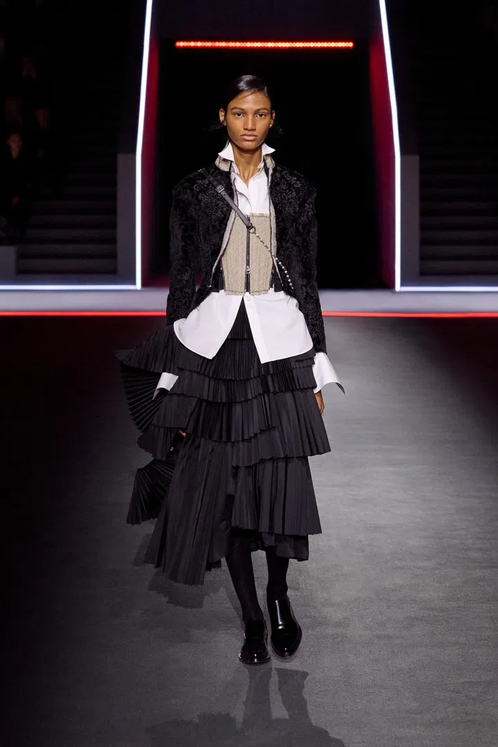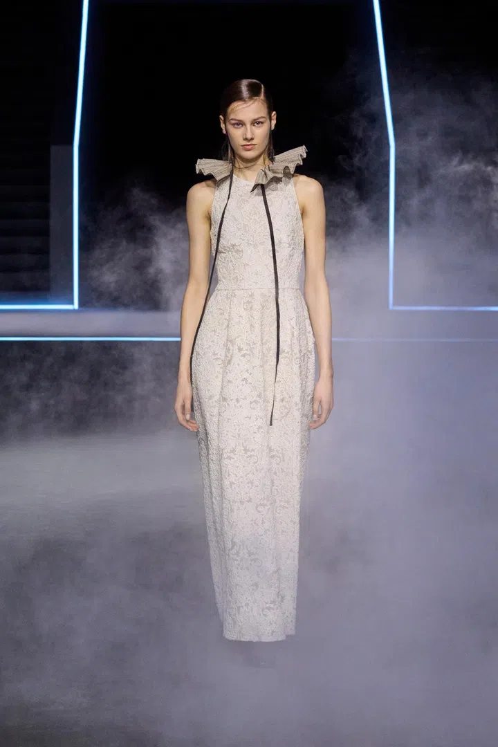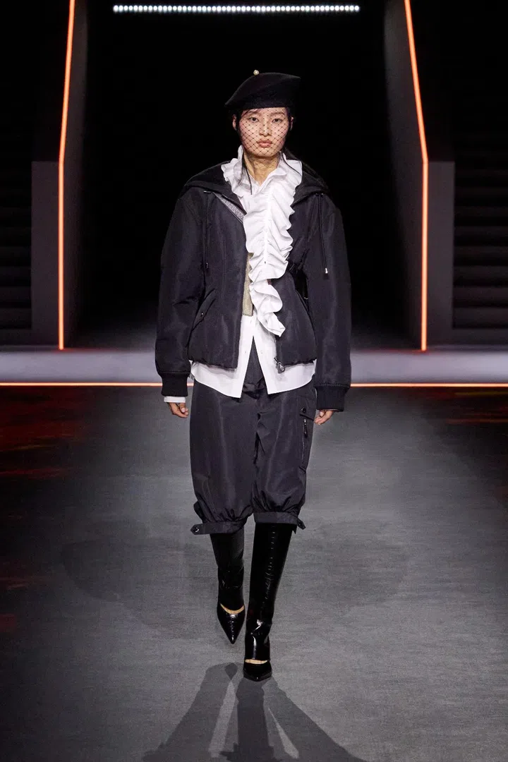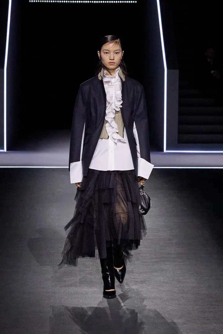 Other Dior-isms included an emphasis on white shirts, which Chiuri sees as the "founding element of an outfit freed from gender stereotypes". In this collection, the shirts came decorated with copious amounts of ruffles - a nod to the highly sculptural work of former Dior creative director Gianfranco Ferre, who led the maison from 1989 to 1989, and was known as the "architecture of fashion".