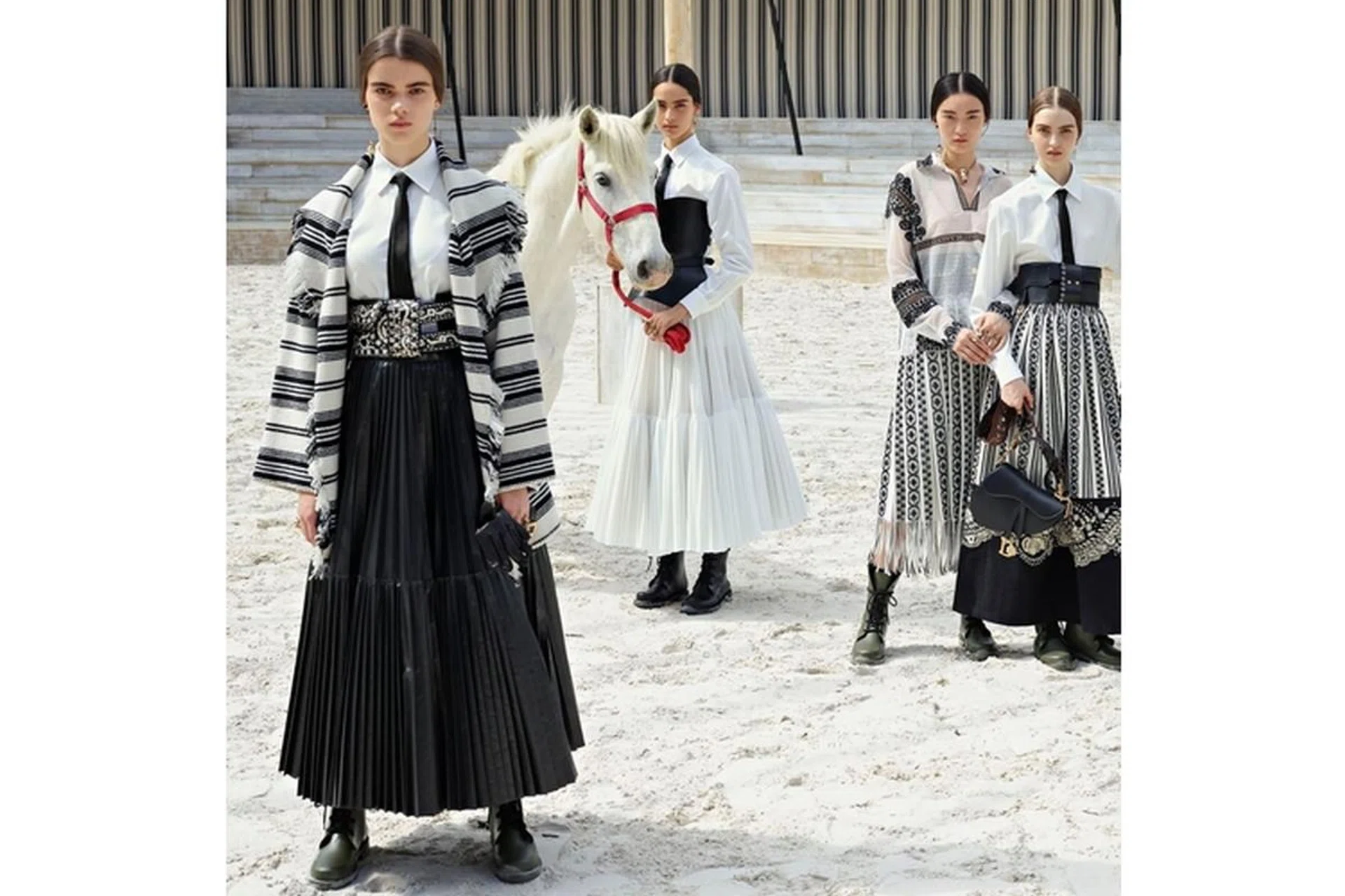 Equestrianism, or the sport of horse riding, is one of fashion's favourite tropes and personally, I adore the look, jodhpur trousers, tall hat, high boots and all. Even if you're not a fan, the khaki Bar suit worn by model Ruth Bell in the first picture is easily integrated into everyday wear. I'm living for that jaunty riding hat.