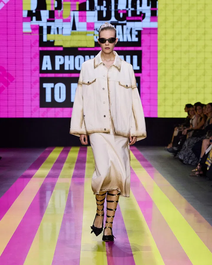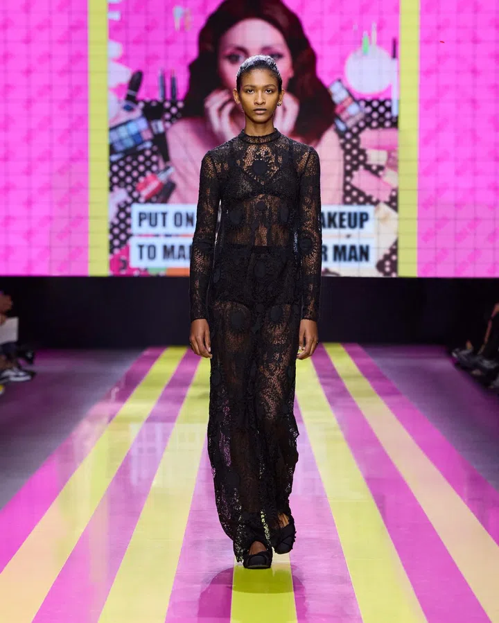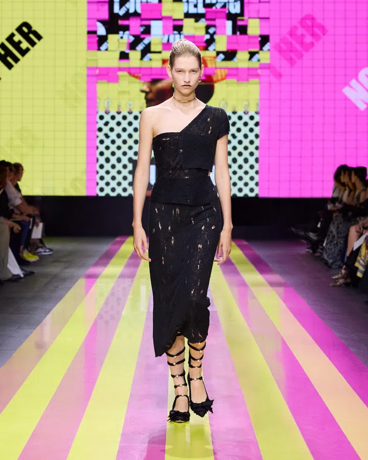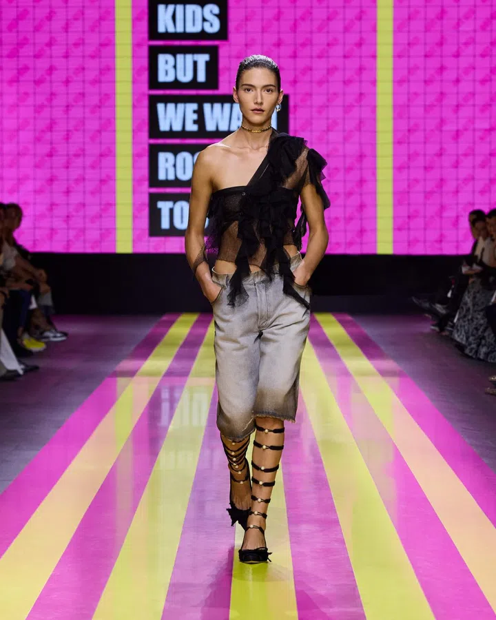 For Spring Summer 2024, a key heroine is the witch, which Chiuri sees as "custodians of the mother-goddess" instead of the usual villains they're typically portrayed as. This translated into a more gauze-y collection - see the opening look of a wispy chiffon and lace confection that was paired with inky lips for instance. Elsewhere, more casual offerings like jeans and shorts came with the appearance of being singed - probably a nod (if obvious) to the fact that "witches" used to be burned at the stake.