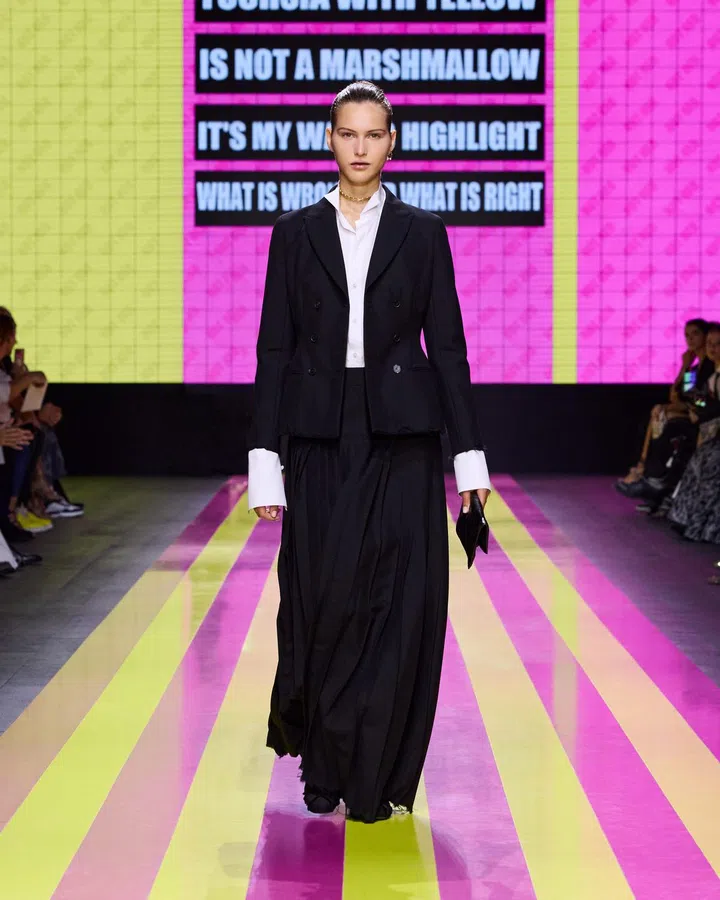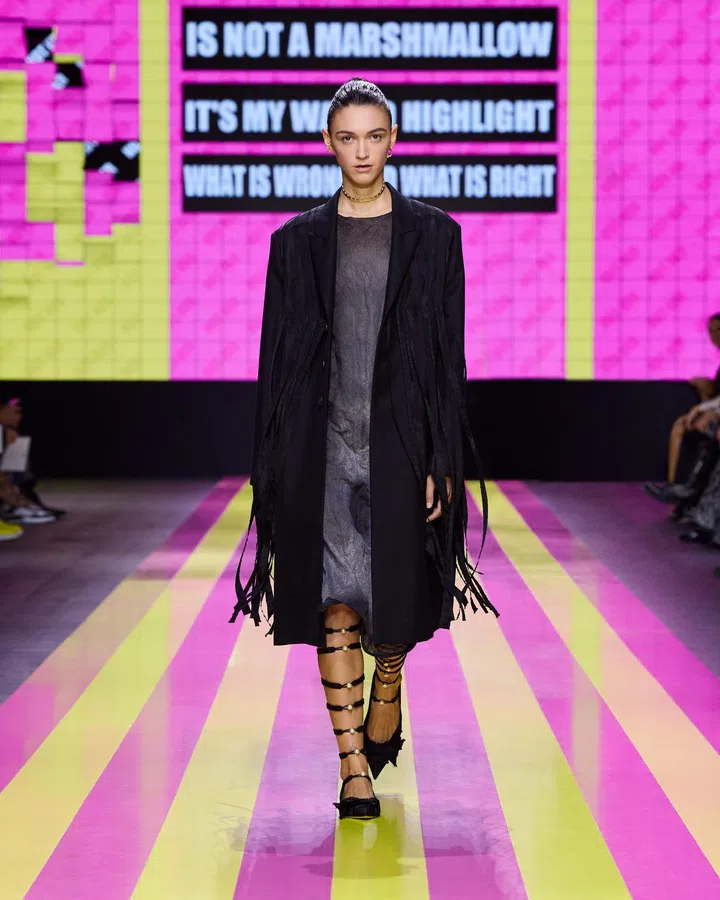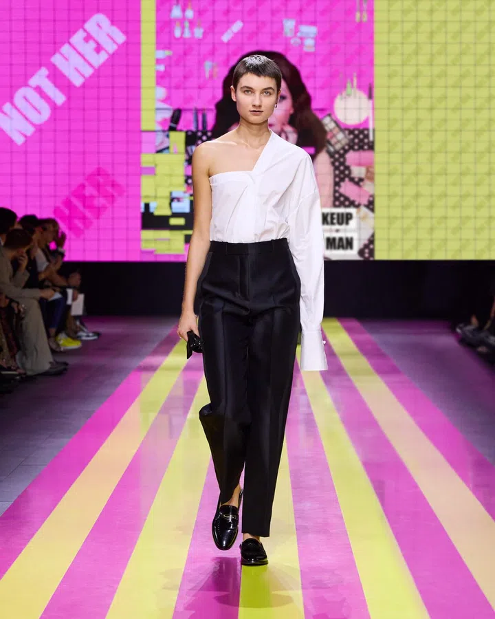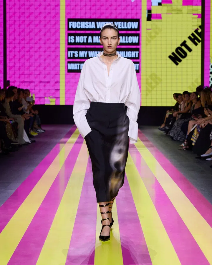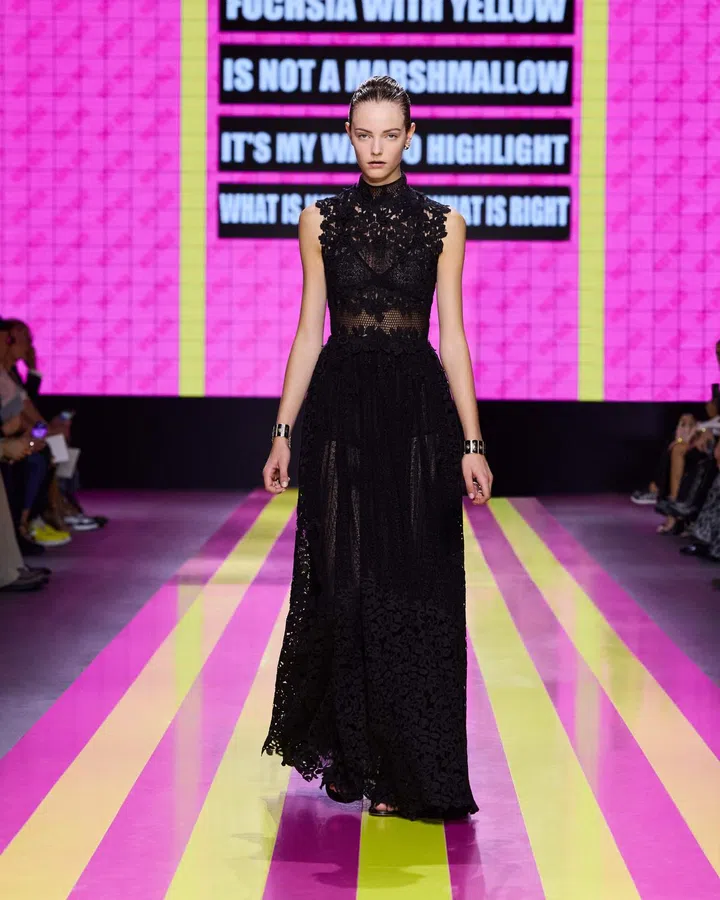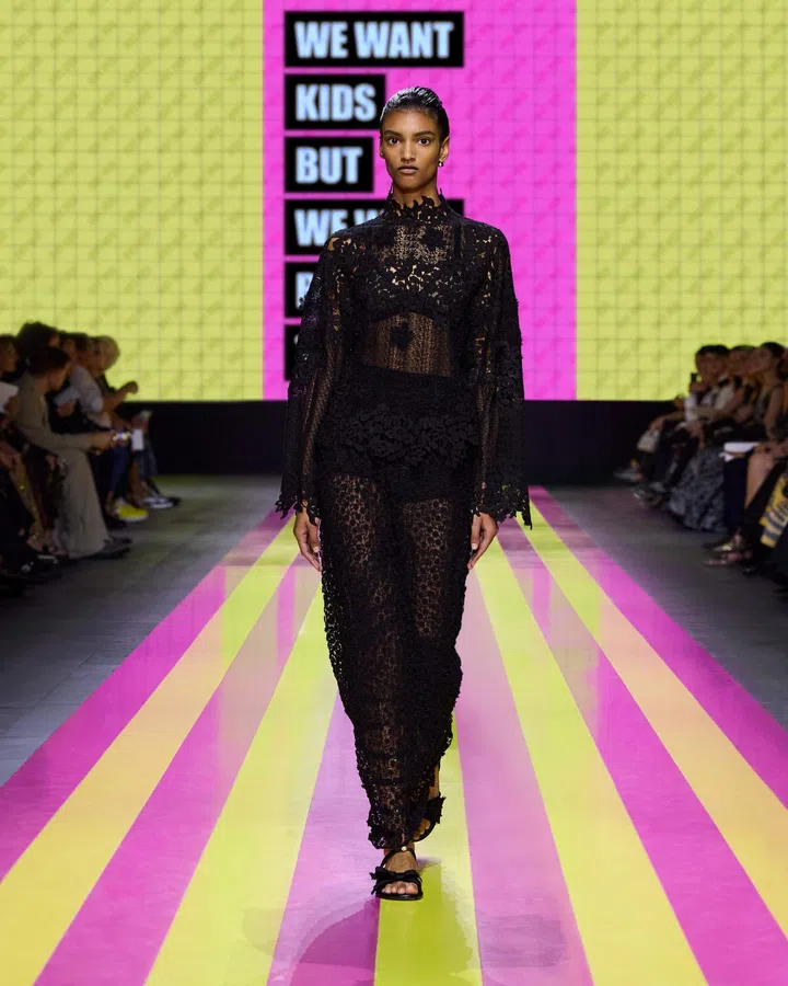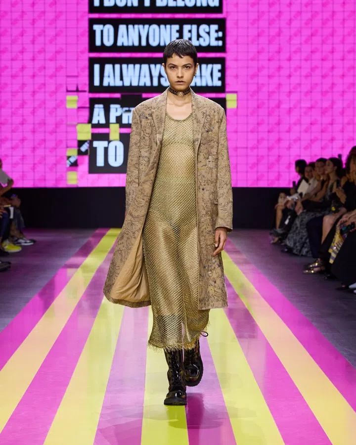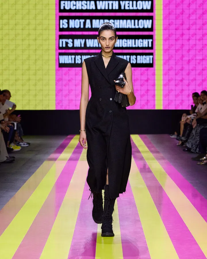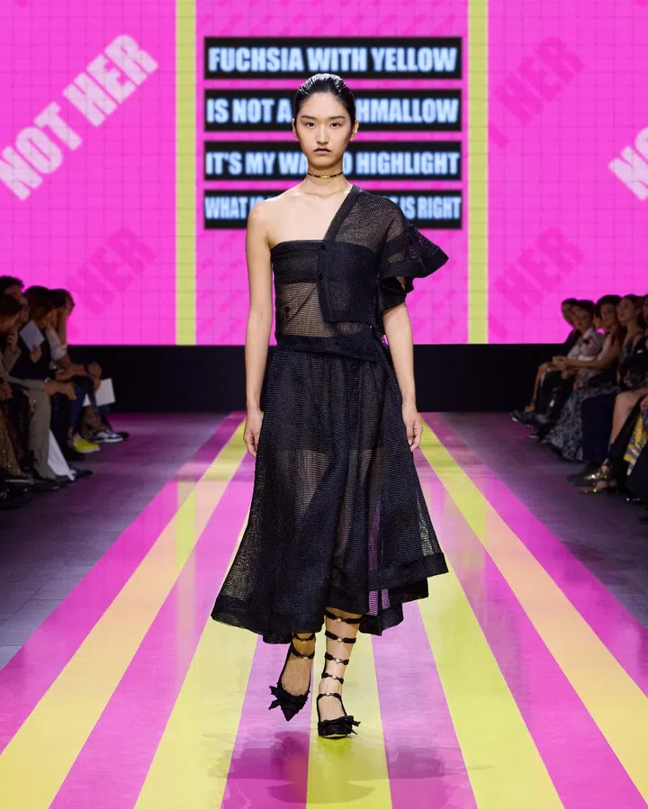 Where: The usual Dior mega cube-esque structure that's set in the middle of Paris' Tuileries Garden. This season, the hot pink and yellow artwork of Italian artist Elena Bellantoni wrapped around the space, flashing slogans along the walls such as "“No-body is yours; No-body is perfect,”" and "Liberation of bodies is not commercial liberalism.”