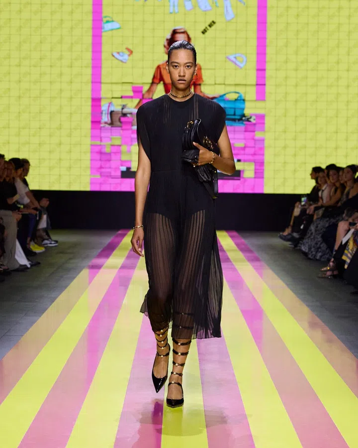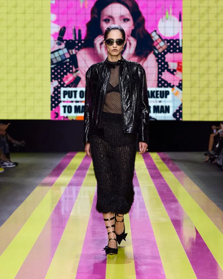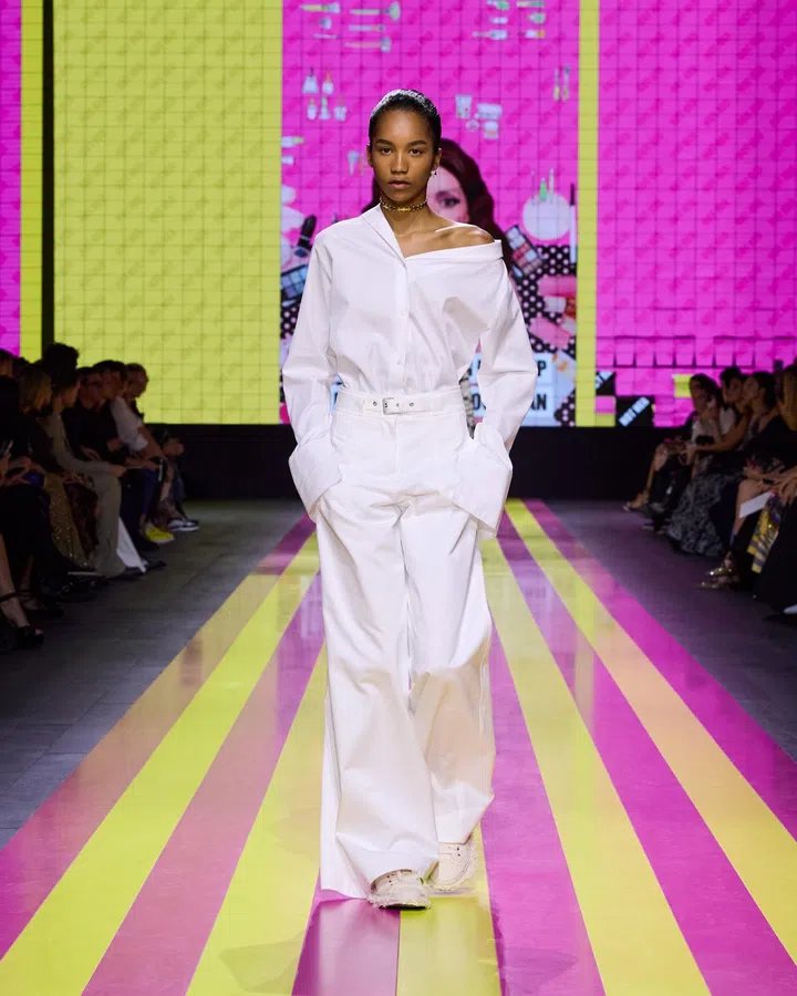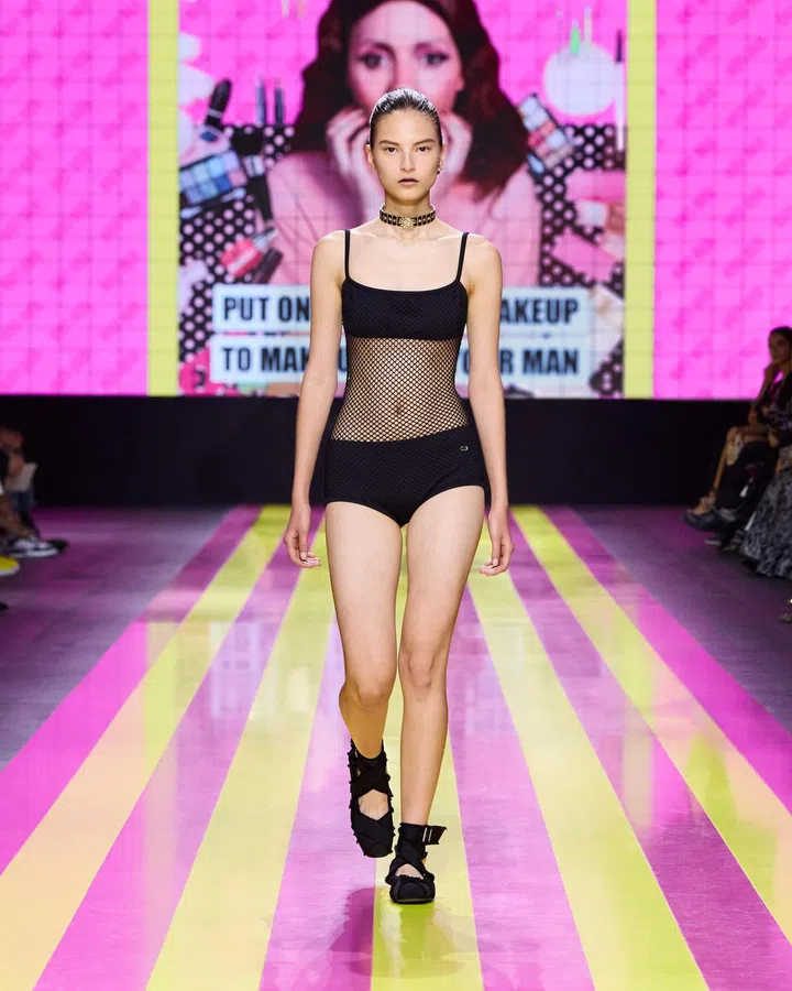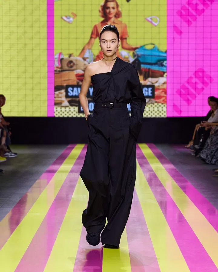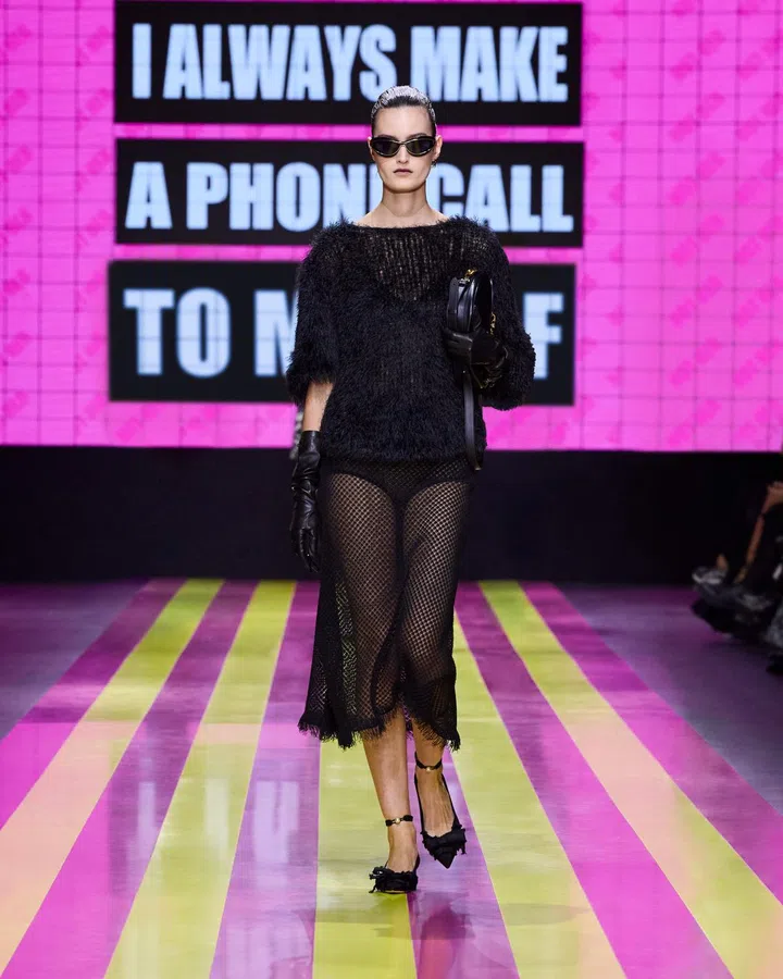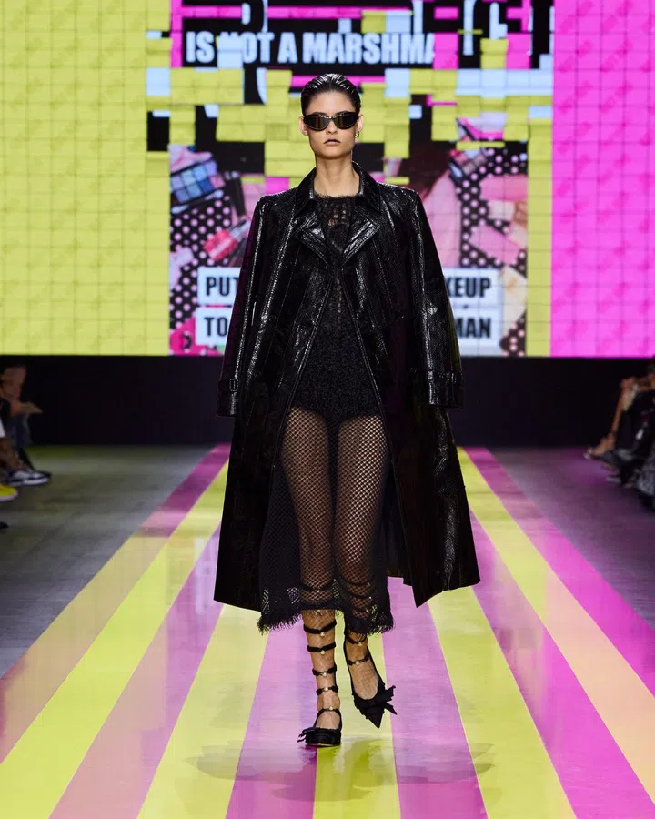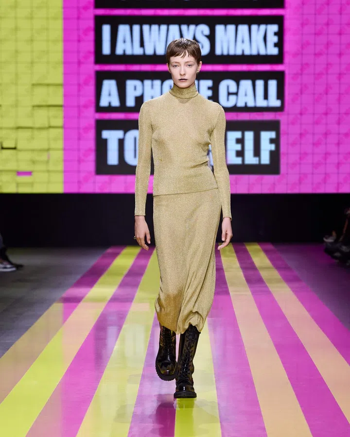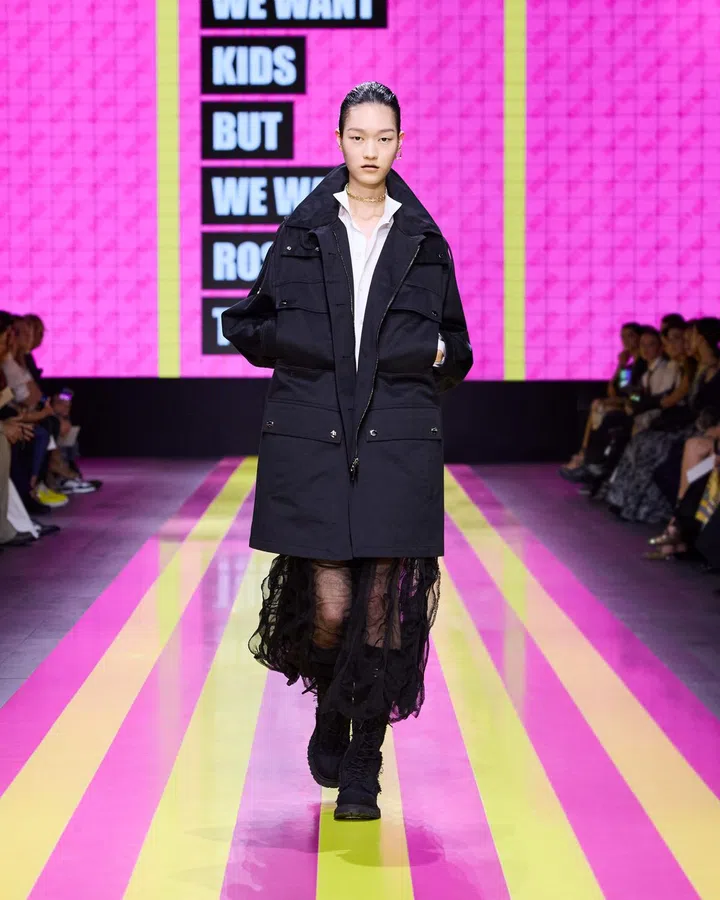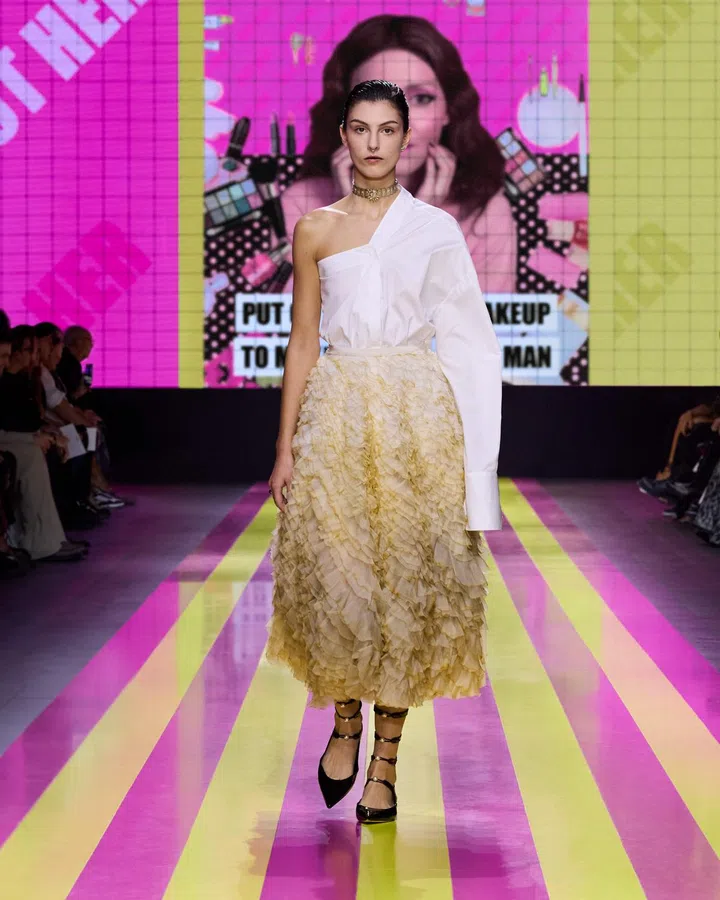 Where: The usual Dior mega cube-esque structure that's set in the middle of Paris' Tuileries Garden. This season, the hot pink and yellow artwork of Italian artist Elena Bellantoni wrapped around the space, flashing slogans along the walls such as "“No-body is yours; No-body is perfect,”" and "Liberation of bodies is not commercial liberalism.”