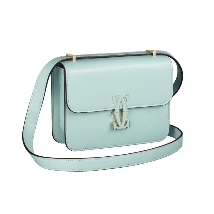 The mini Double C de Cartier chain handbags are available in colours of black, red, powder pink, capri blue and mint green.