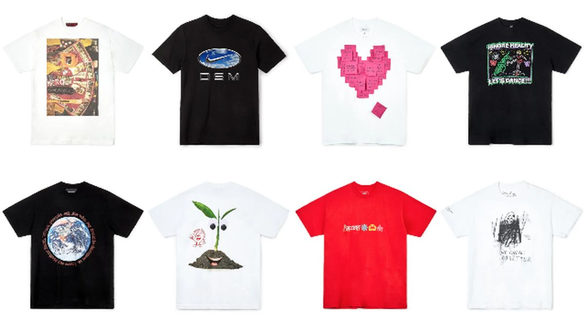 More than 15 brands and designers of DSMS answered the call to create a capsule collection of T-shirts. Among them were Doublet, Nike, Doublet and Bianca Chandon and Wes Lang. Each had carte blanche to create their uplifting prints and messages. For instance, Walter van Beirendock featured a caricature of himself holding a giant red balloon plastered with the slogan 'Dream A Bold New World'.