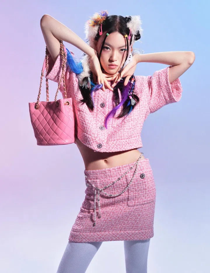Tweed jacket, matching skirt, leather bucket bag and metal chain belt with glass beads and stress, Chanel. Tights, stylist’s own