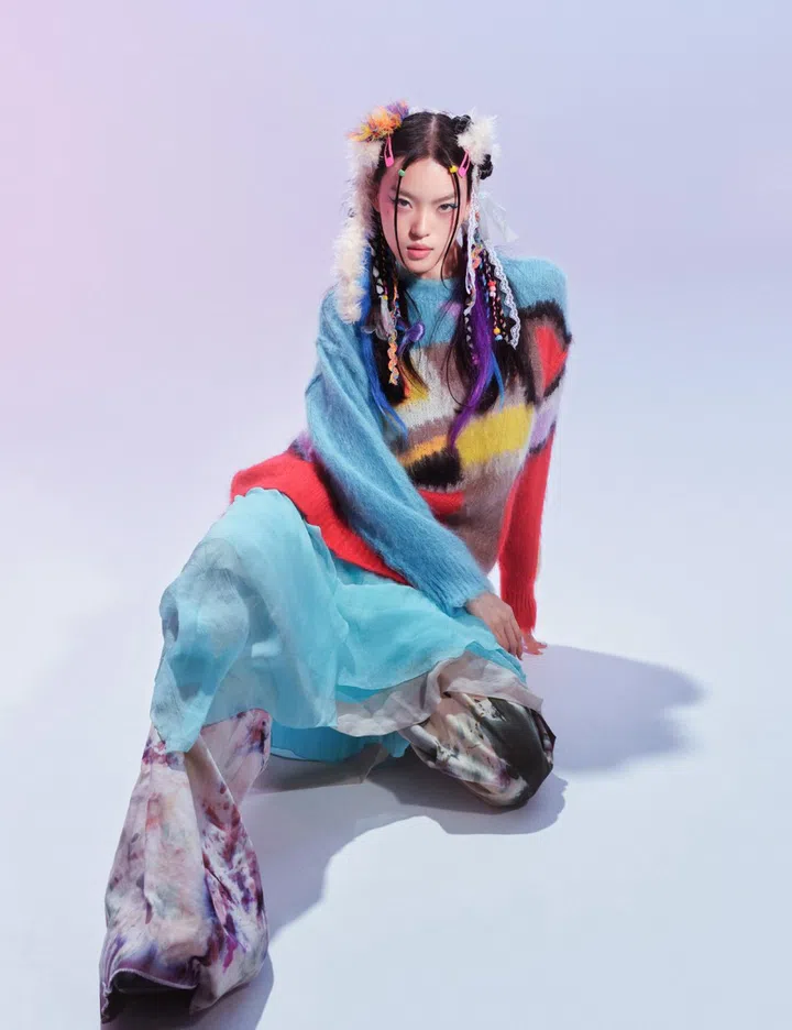 Mohair pullover and silk dress, Fendi. Fassbender & Mellon Collie denim jeans, fassbenderandmelloncollie.xyz. XL Spandex pumps, Balenciaga