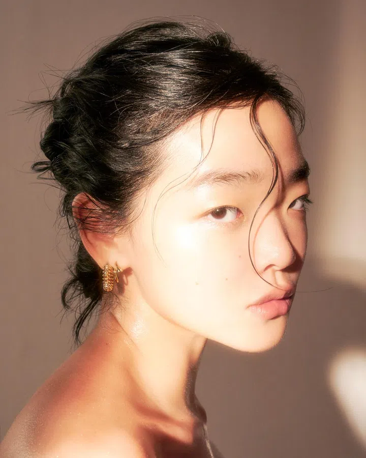 Shine as bright as your jewels with Marc Jacobs Beauty’s O!mega Glaze All-Over Foil Luminizer, a glitter-specked, micro-fine powder highlighter that comes in a supersized compact, making it easy to achieve an iridescent glow from head to toe. Clash de Cartier 18K pink gold hoop earring (on upper lobe) and Juste Un Clou 18K yellow gold earring.