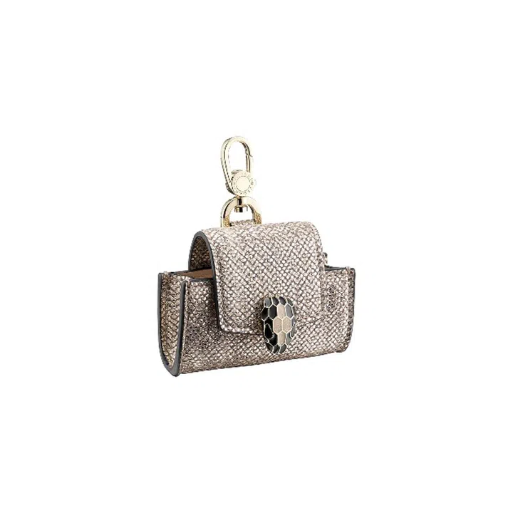 Looking for a glamorous earbuds bag? Bvlgari turns up a sophisticated version in karung leather complete with the house's iconic Serpenti snakehead in gold-plated brass with a black and glittery beige enamel.