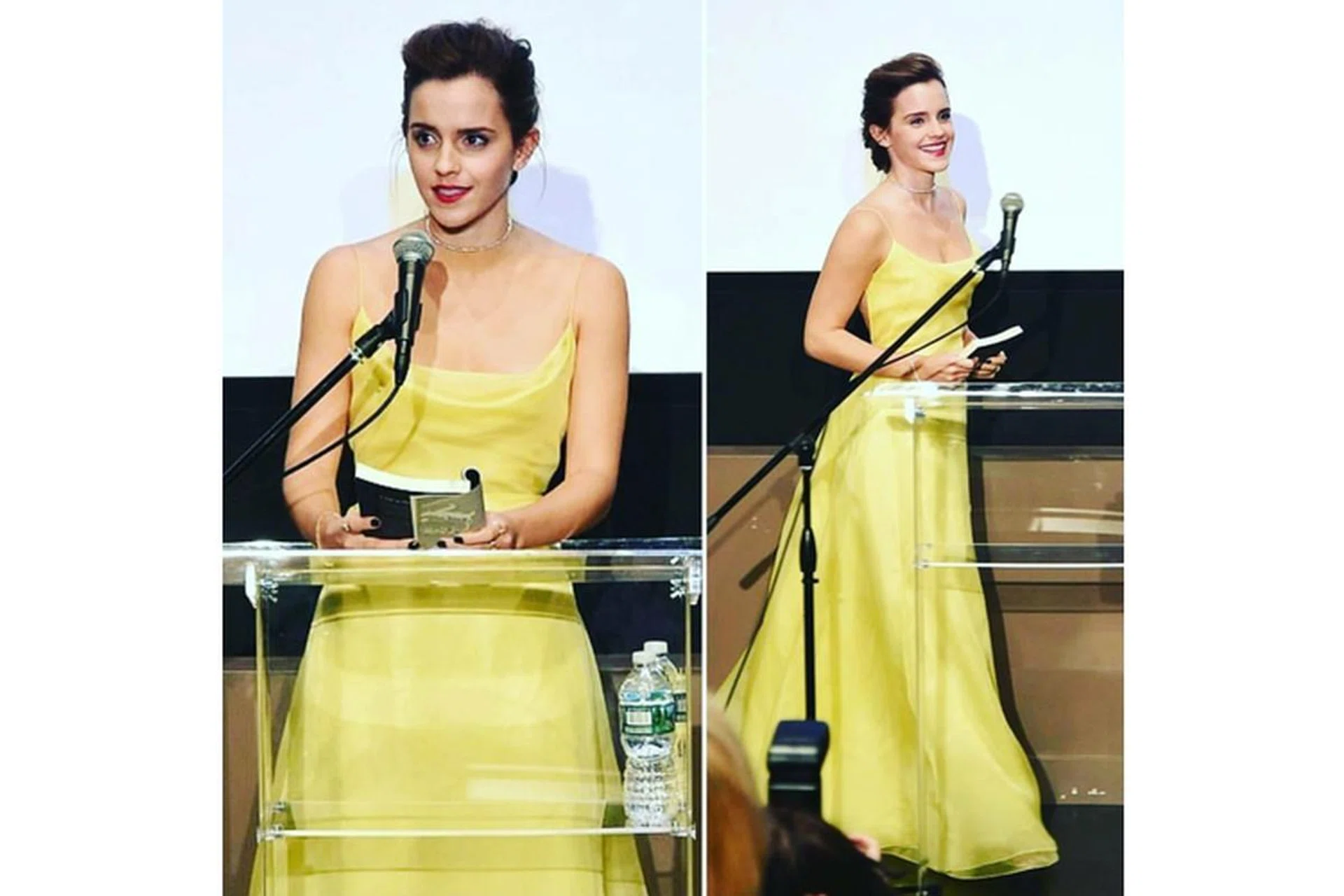 Reading aloud from Beauty and the Beast to the audience (how very Hermione Granger of her), the Belle connection was instantly made with her yellow spaghetti-strapped backless dress - a modern update on the iconic tiered gown worn in the 1991 animated version.