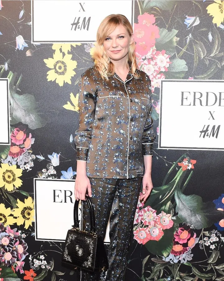 The Beguiled star Kirsten Dunst took a more relaxed approach (literally) with her pyjamas set - though her embellished top-handle bag (also from the Erdem collection) added some polish to her outfit.