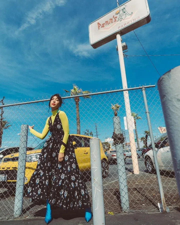 Chinese artist and influencer Molly Chiang took a more editorial route to styling her Erdem dress - she's already starting on Spring 2018 trends by wearing a lime green turtleneck underneath. Most people might have stopped there but Chiang upped the game further by adding cyan blue Balenciaga boots to great effect.