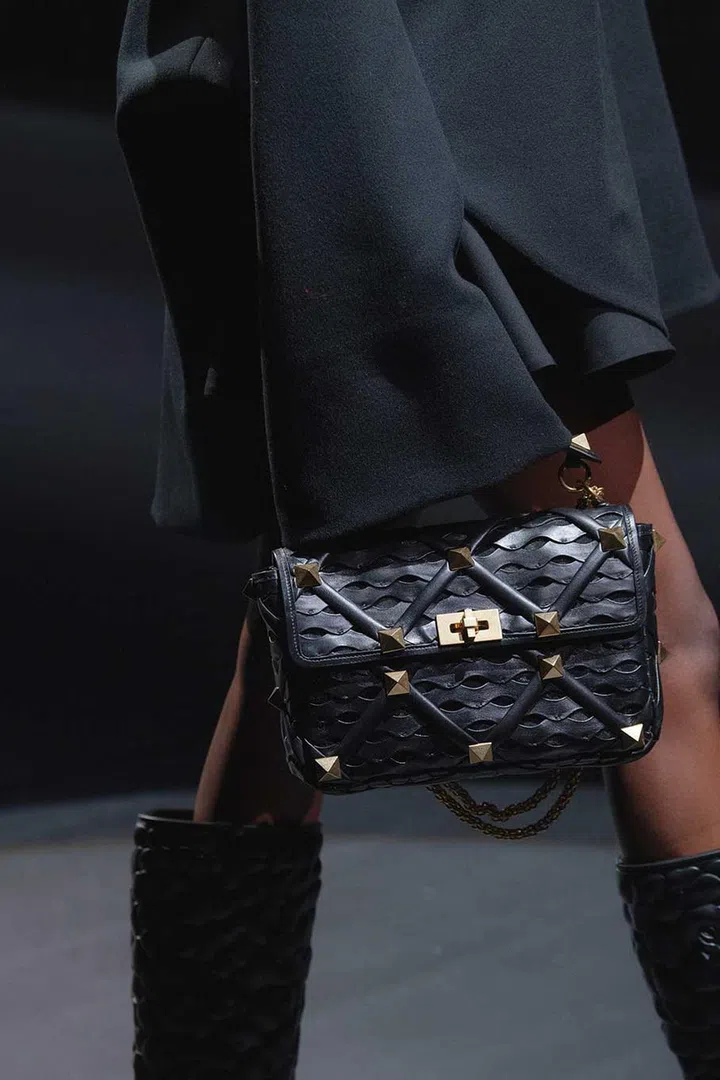 Brevity was on Pierpaolo Piccioli's mind for the season, with hemlines and fabrics being slashed in a multitude of ways. Most intriguing was a laser-cut technique that created a peek-a-boo net effect on garments, translated here onto a Roman Stud bag with a layered look.