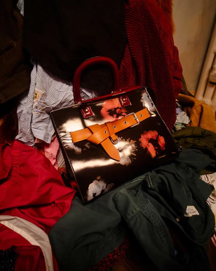 The dark, romantic floral prints on this Marni bag were the result of an experiment that Francesco Risso had conducted, placing real flowers on black fabrics and letting the sun melt and bleed away at its colours.