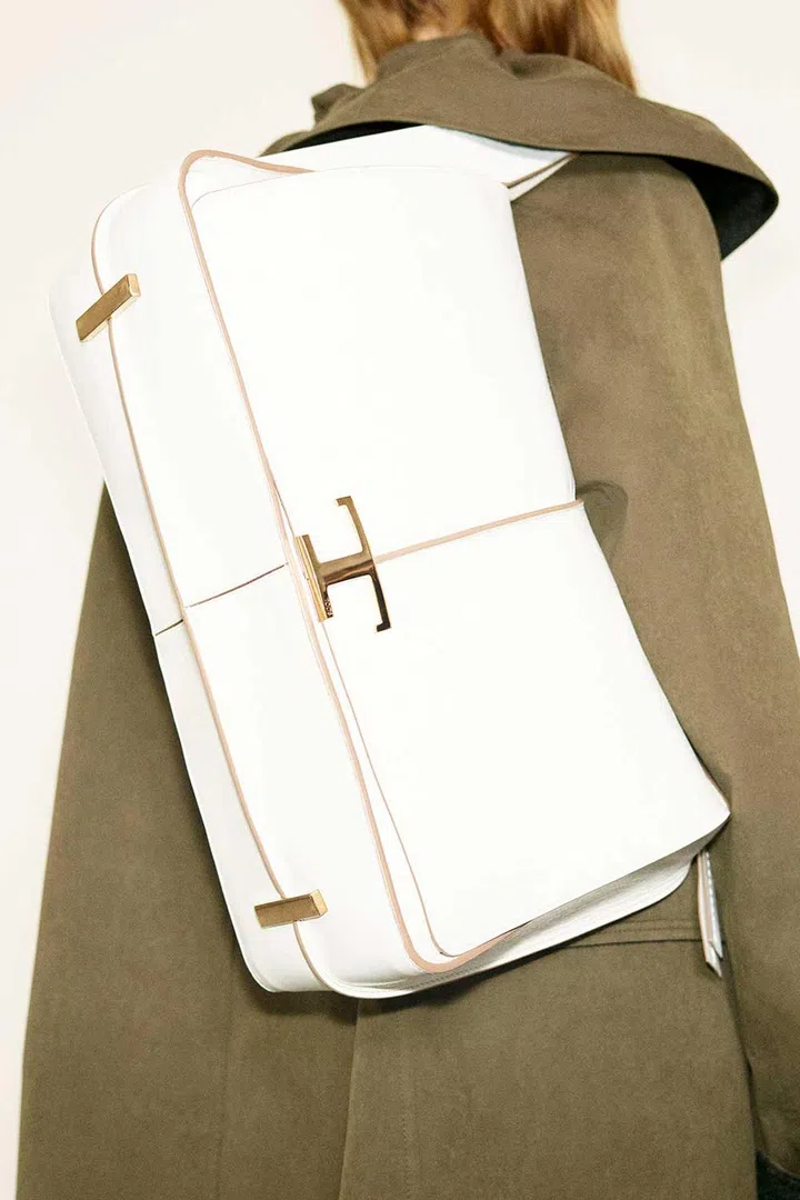 This new addition to Tod's T Timeless range is exaggeratedly large, in the spirit of Walter Chiapponi's voyage this season into the overlaps of functional sportswear and voluptuously feminine haute couture.