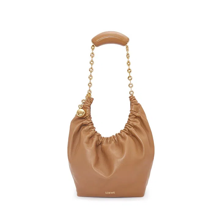 Loewe is taking the soft, squishy bag to a new level with the Squeeze, its latest design. It’s crafted from super soft unlined lambskin nappa leather with a ruched detail near the opening. It’s held together by a doughnut chain and a squishy leather handle (which it gets its name from) that can be hidden inside the ruching or extended to wear the bag on the shoulder and cross-body. Fun fact: the chain is gold-plated and made from a stainless steel and aluminium alloy specially developed to keep it light – easily the funkiest, most innovative design of the season.