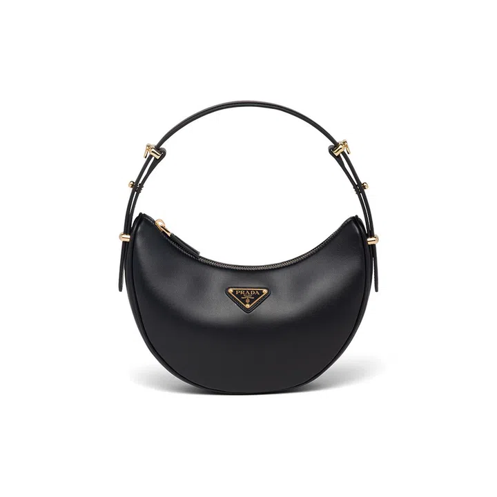 Geometry is on the mind this season at Prada with the introduction of the crescent-shaped Arque bag. It’s a familiar hobo style, but the details tell the story of shape and balance. The bag is circled by two bands of leather, which frame the base and form the handle. On the handle are D-rings that allow you to attach a longer strap to wear it crossbody. And in signature understated Prada style, it’s decorated with the enamelled triangle logo that matches the black, white or cognac leather.