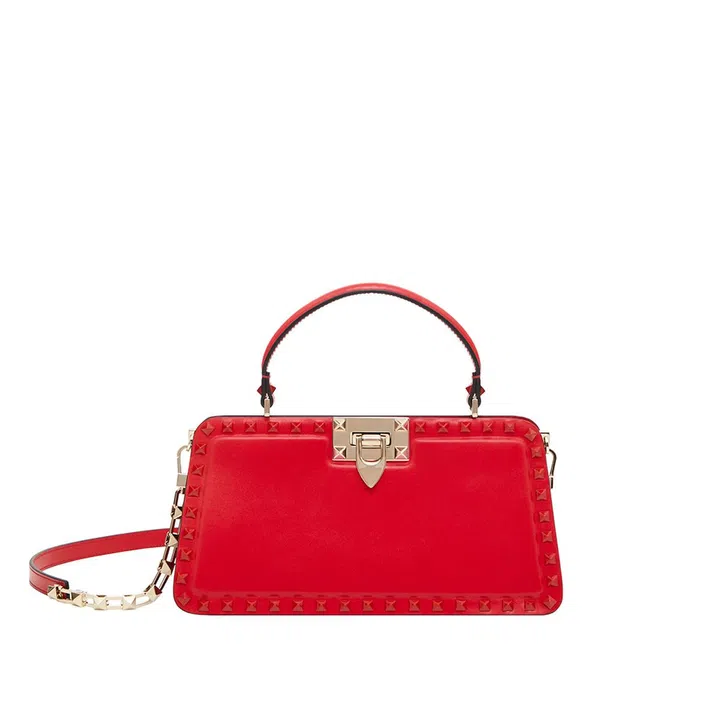 Valentino’s Rockstud bags come in a new top-handle style this season. The compact bag is designed in the trendy horizontal trapezium shape and features the signature metal stud details along the clasp, top handles, chain and lacquered studs around the frame of the bag. What’s extra cool is a high-frequency leather technique that creates a quilted bas-relief effect around the studs on the front.