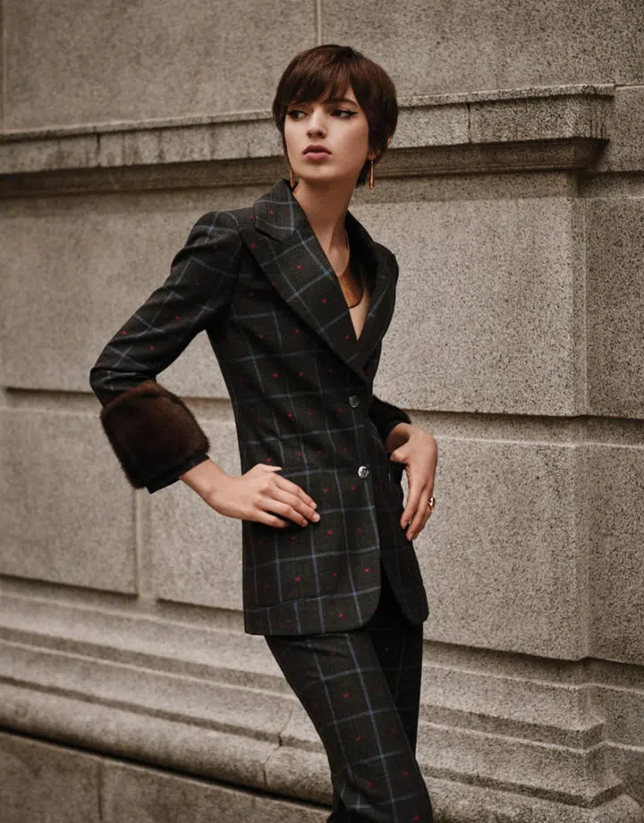 Wool blazer with mink fur and wool pants, Gucci. Avant 22K Mode Gold 916 drop earrings, and Bold 22K Mode Gold 916 necklace and matching ring, Goldheart