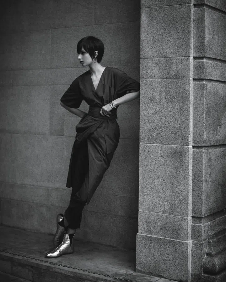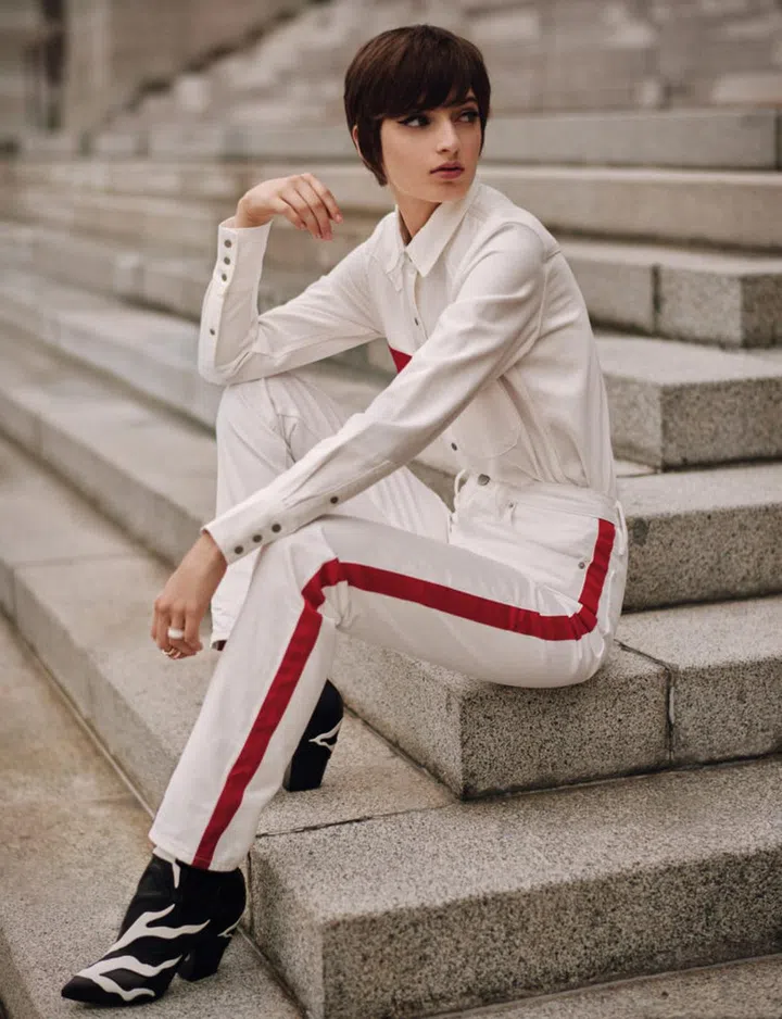 Cotton shirt and pants, Calvin Klein Jeans. Leather boots, Louis Vuitton. B.zero1 rings in 18K pink gold and ceramic with diamonds, Bulgari