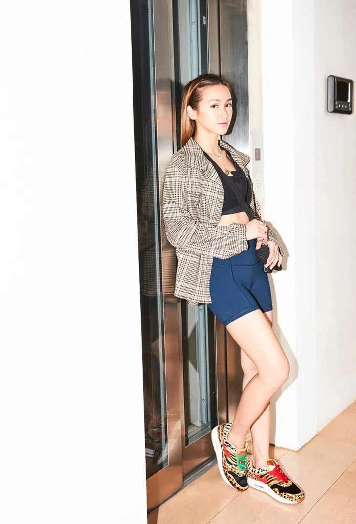 Seah's shorts are from Lululemon. She pairs it with an oversized jacket from Taobao, and anchors the outfit with a pop of animal print by way of Nike Air Max 1 Atmos sneakers.