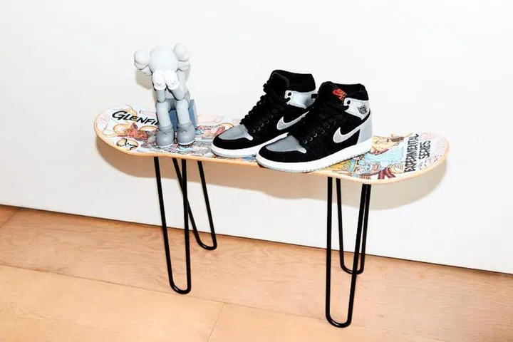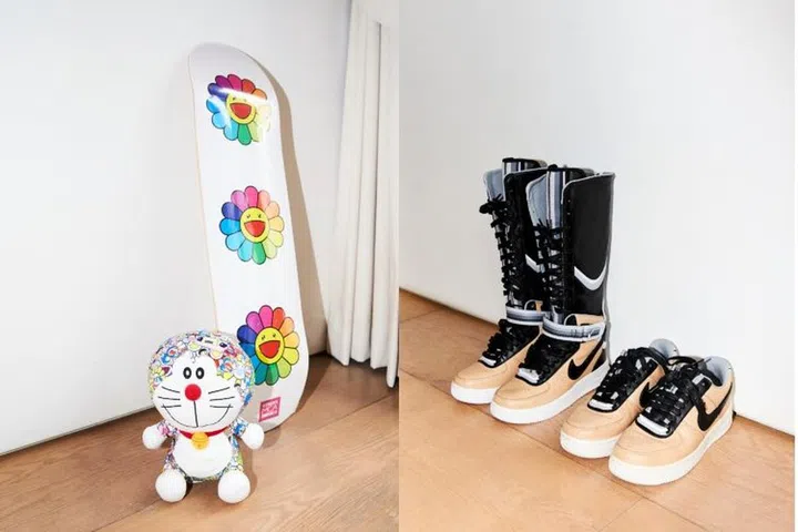 It's not just sneakers Seah loves — she also enjoys collectibles such as the Doraemon x Takashi Murakami for Uniqlo plush toy, and a Takashi Murakami x Complexcon skateboard deck (left). Right: NikeLab x Riccardo Tisci AF1 Knee Hi and Low Beige. The latter, one of her first pairs of sneakers.