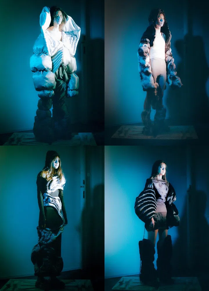 Her idea is to give form to the emotional power of music on the mind and body and, true to the concept, the results are as intellectual as they are heartwarming – or should we say, cosy. Tailored or body-skimming separates boast exaggerated sleeves and appendages crafted from a satin-like fabric, resembling pillowy, wearable sculptures that wouldn’t look out of place at an underground club.