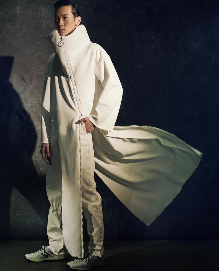 Simple ideas can make a huge impact. Tan worked solely with the colour white, but far from bland, her menswear collection features blown-up takes on classic silhouettes, equally exaggerated details as well as an unexpected contrast in materials and techniques all in one garment. Our favourite look? This floor-sweeping coat with a hyper-raised collar and XL (and extra-long) zipper.