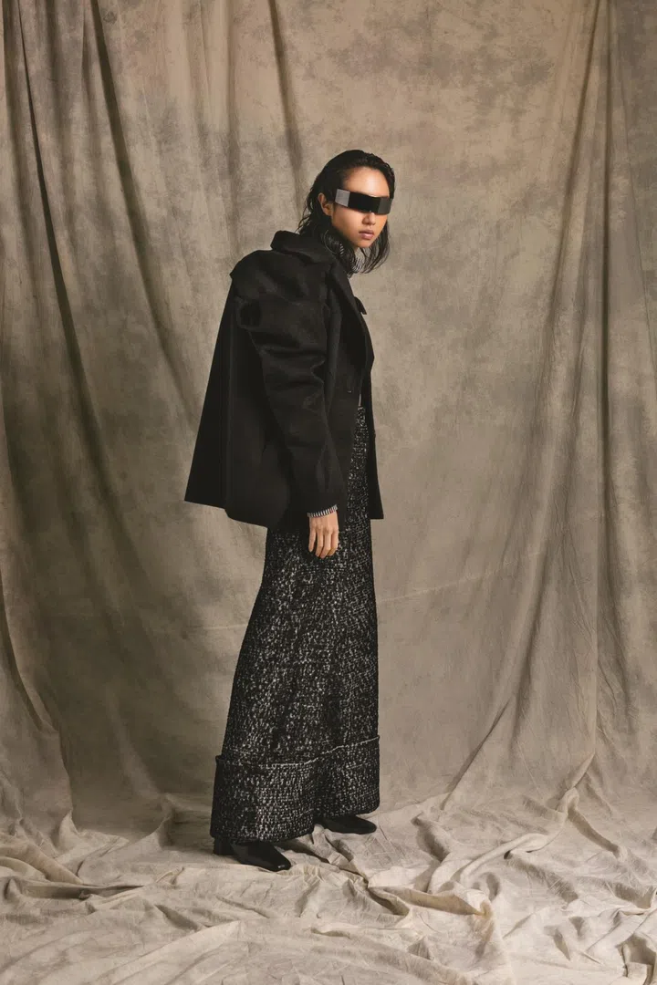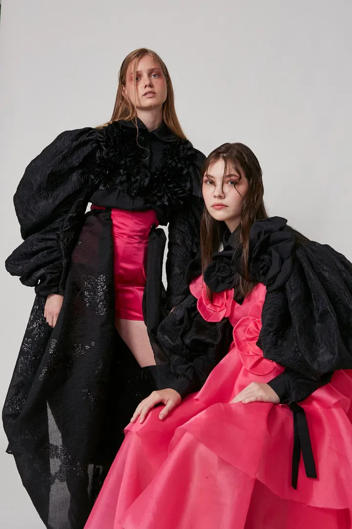 Using a contrasting colour palette of black and fuchsia, she plays with volume and undulating floral details (she’s fascinated with couture) to create pretty and sumptuous tailored gowns and coats that Simone Rocha fans might dig. “The whole experience of creating the project during the pandemic and at this stage in life has forced me to be more independent and flexible,” she says.