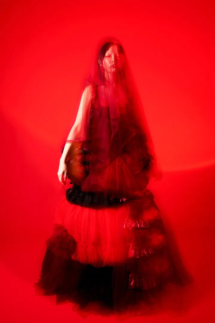 The name of and theme behind the Singaporean graduate’s collection is far from pretty: dysmenorrhoea aka menstrual cramps. Her dramatic confections – tiered skirts and dresses, and ruffled bra tops crafted from a mix of tulle and other materials and embellishments that lend both volume and tactility – are twistedly so. (Naturally, the dominant colour throughout is crimson.)