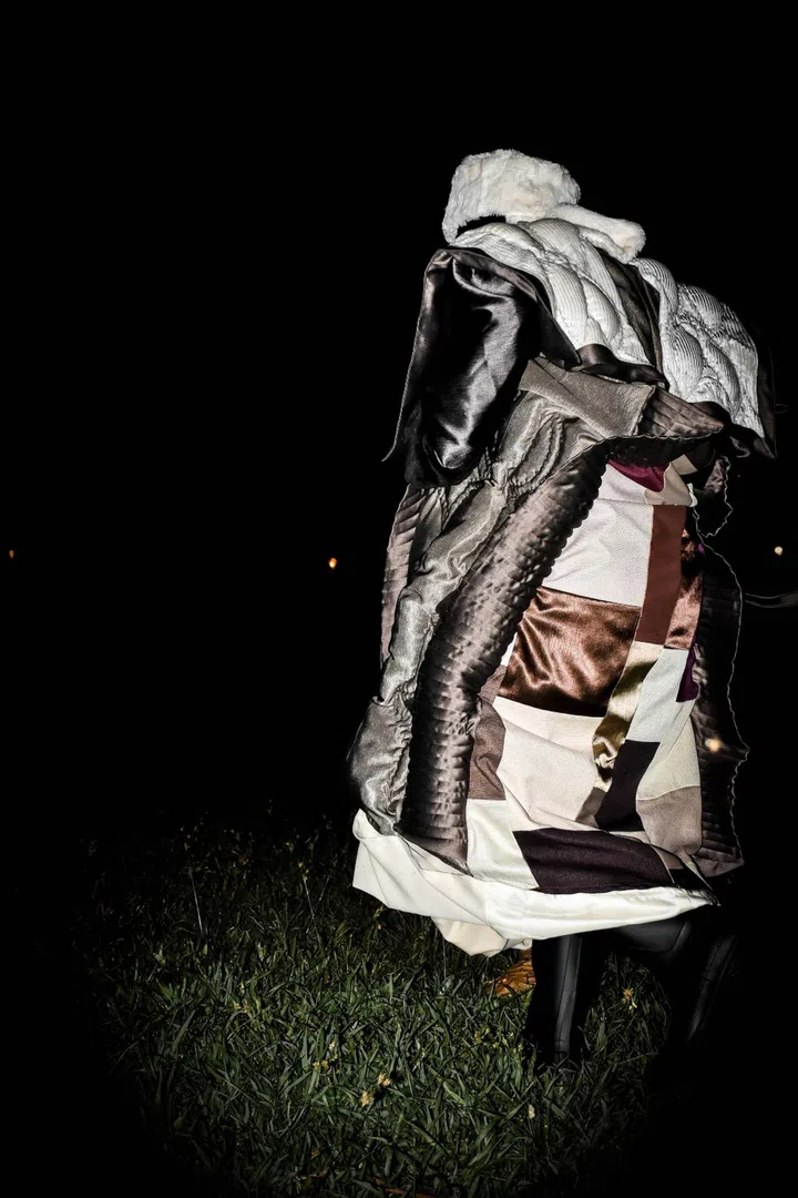 Liu’s approach however is anything but. Using a hotchpotch of sourced recycled materials (faulty samples from mass-market retailers, textile waste from upholstery companies, swatches from fabric books) in a bid to be environmentally conscious, she’s fashioned out coats and dresses with cushion-like finishes as a playful ode to home wear.