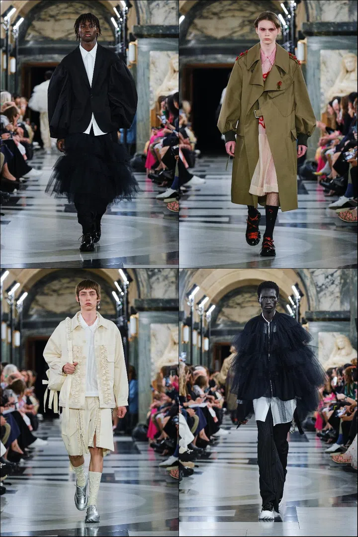 The haunting world of Simone Rocha now has men in it. Intending to reflect the beauty of masculinity, the menswear designs within the Spring/Summer 2023 show were almost an antithesis to what she had been making in the past. Notions of protection such as petticoat detailing, military garments and black tailoring introduced an almost paradoxical ruggedness into Rocha’s ideal of menswear, while softer details like ruching and the use of tulle seek to ground the look to the brand’s sensibilities.