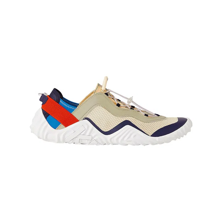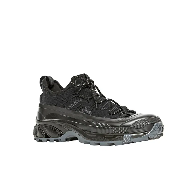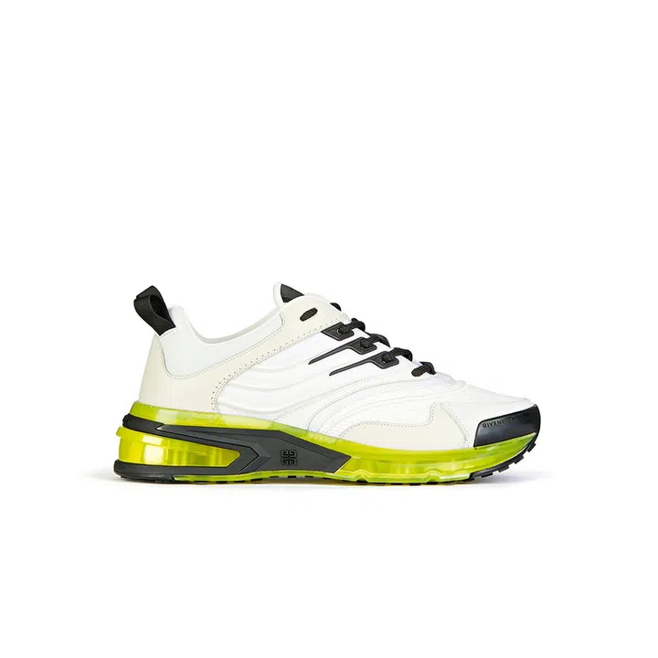 A streamlined upper in an unexpected mix of leather, technical fabric and mesh on a transparent sole = Matthew Williams’ first sneaker for the house of Givenchy