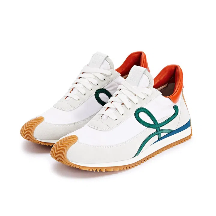 Inspired by ’70s track shoes and distinguished by soles that curve over the heels and toes, these suede and nylon sneakers get an extra jolt with accents in summertime hues as part of the brand’s latest Paula’s Ibiza collab.