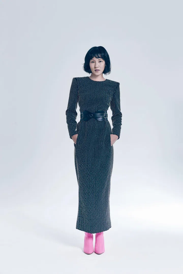 Kwan wears wool crepe column dress, Givenchy, satin boots, Giuseppe Zanotti, and her own Alaia belt.