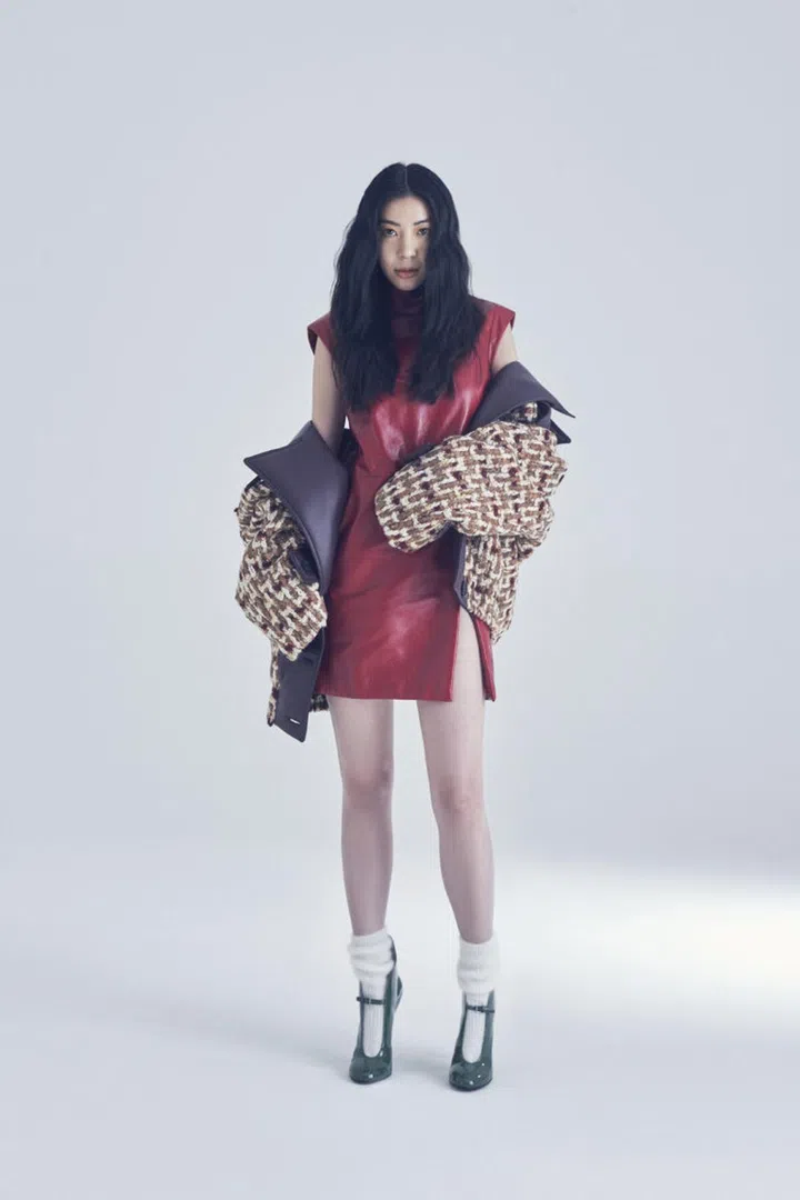 Chaang wears leather and wool jacket, leather minidress, wool socks, and patent leather Mary Janes, Miu Miu.