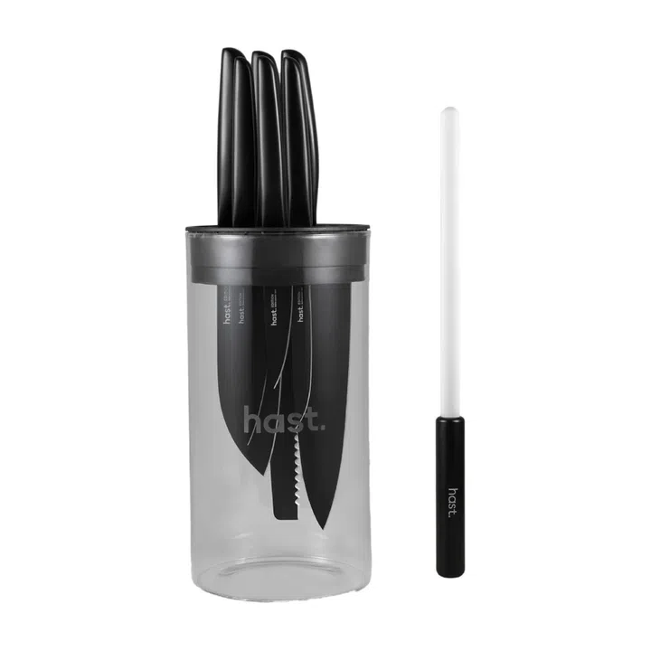 In this set by Hast, you'll find a chef’s knife, a bread knife, a utility knife, a boning knife, a paring knife, a custom ceramic honing rod, and a sleek glass knife block. It's not just a chef's dream – it's a minimalist's dream too.