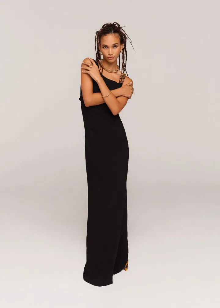 Fendace silk cady dress and leather sandals, Fendi. Clash de Cartier double row earrings, XL necklace, large ring (on right thumb), double row ring (on right index finger), medium and small rings (worn stacked on right middle finger), medium supple bracelet (on left arm), and XL ring (on left middle finger)
