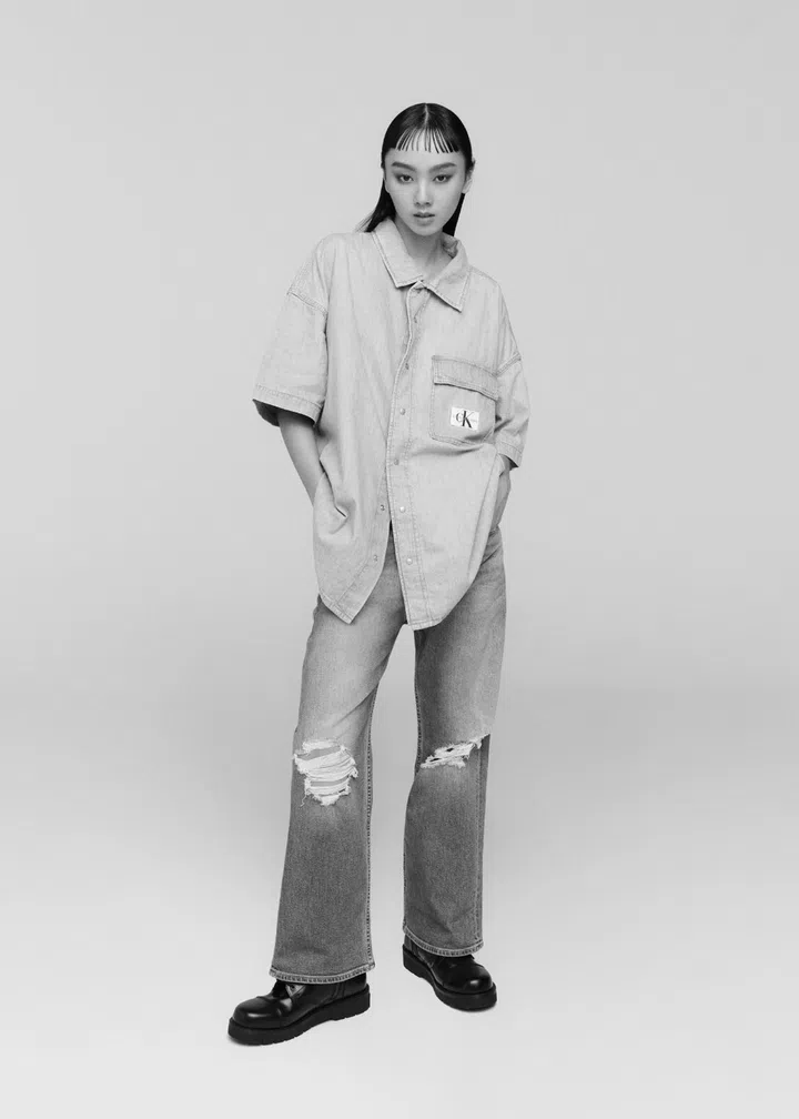 Denim shirt and jeans, Calvin Klein. Calfskin boots, Balenciaga