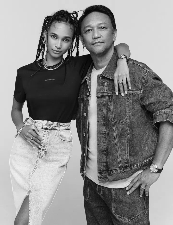 On Iman: Cotton T-shirt and denim skirt, Calvin Klein. Clash de Cartier double row earrings, medium supple necklace, small and medium supple bracelets (worn stacked on right hand), small and medium rings (on right thumb and middle finger respectively), Pasha de Cartier Grid 30mm watch with diamonds on leather strap (on left hand), and Clash de Cartier double row ring (on left middle finger). On Fandi: Denim jacket and matching jeans, Calvin Klein. Clash de Cartier white gold supple bracelet (on right hand), Pasha de Cartier Grid 41mm yellow gold watch with leather strap, and Clash de Cartier medium white gold ring (on left ring finger). T-shirt, his own