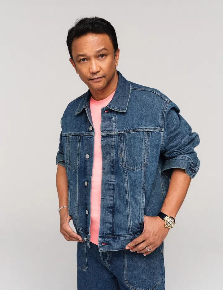 Denim jacket and matching jeans, Calvin Klein. Clash de Cartier white gold supple bracelet (on right hand), Pasha de Cartier Grid 41mm yellow gold watch with leather strap, and Clash de Cartier medium white gold ring (on left ring finger). T-shirt, his own