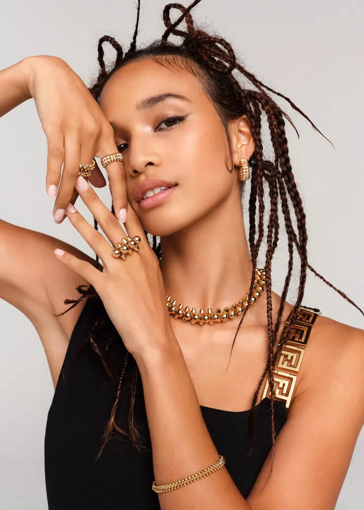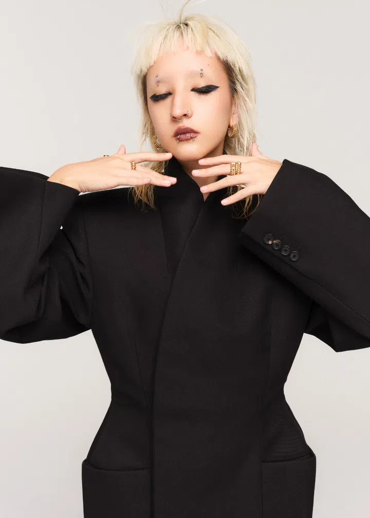 Wool blazer, Balenciaga. Clash de Cartier double row earrings, medium ring (on right middle finger), large ring (on right thumb), and double row ring and small ring (stacked on left middle finger), Cartier. Facial piercings, her own. All jewellery and watches throughout, in pink gold and from Cartier unless otherwise stated