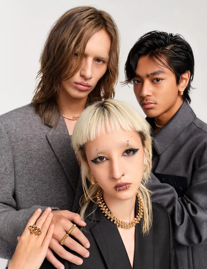 On Tristen: Wool blazer, Loewe. Juste un Clou small yellow gold necklace and Clash de Cartier small rings (on index and middle fingers). On Martina:Wool blazer, Loewe. Clash de Cartier double row earrings, XL necklace and XL ring. Facial piercings, her own. On Zilhanz: Wool parka, Loewe. Clash de Cartier large single earring and medium supple necklace
