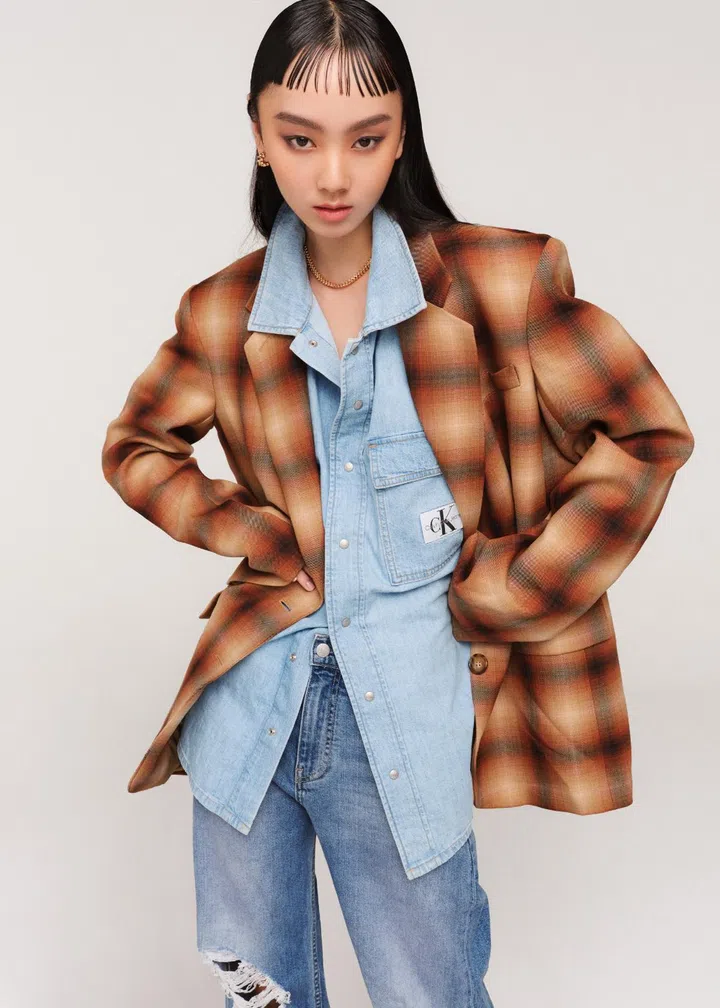 Wool blazer, Sportmax. Denim shirt and jeans, Calvin Klein. Clash de Cartier large single earring and medium supple necklace