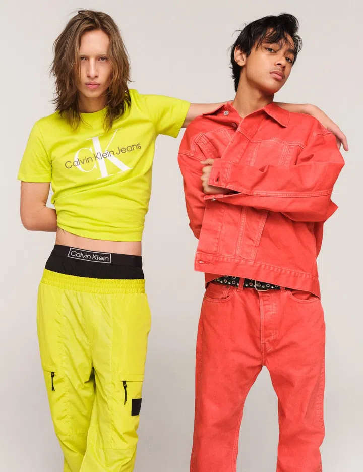 On Tristen: Cotton T-shirt and briefs, and nylon track pants. On Zilhanz: Denim jacket and matching jeans. Belt, his own. All Calvin Klein unless otherwise stated