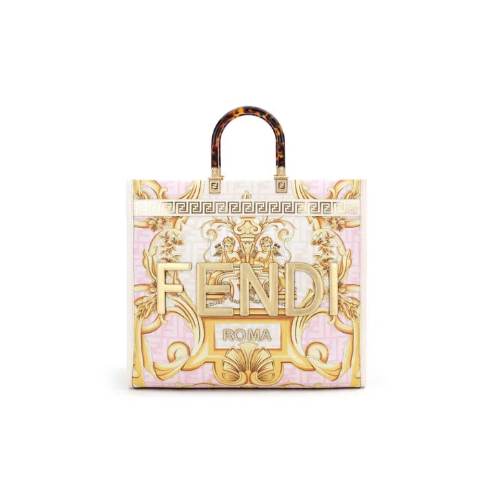 Likewise, monogrammed fabrics have been overlaid with Barocco prints and Greek key motifs are punctuated with double Fs – see the Sunshine shopper (yes, as part of Fendace, it sports gilded handles too).