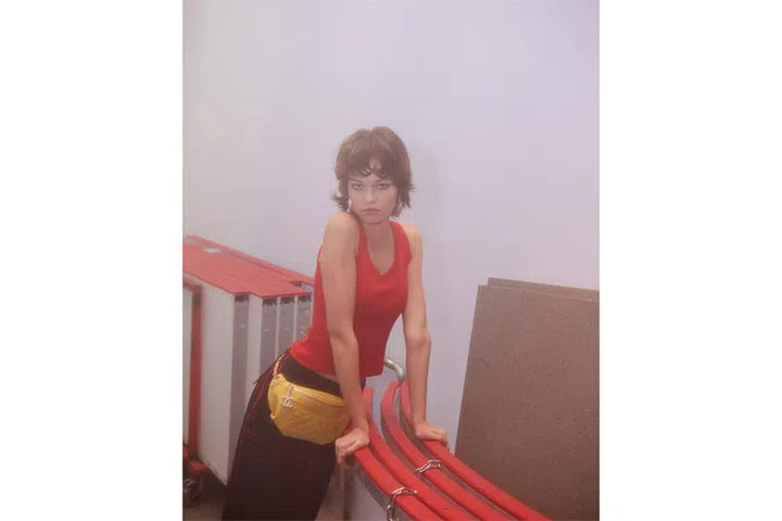 Cotton tank top, Miu Miu. Cotton pants, Prada. Saint Laurent by Anthony Vaccarello silver earrings, Saint Laurent. Calfskin fanny pack, Chanel.