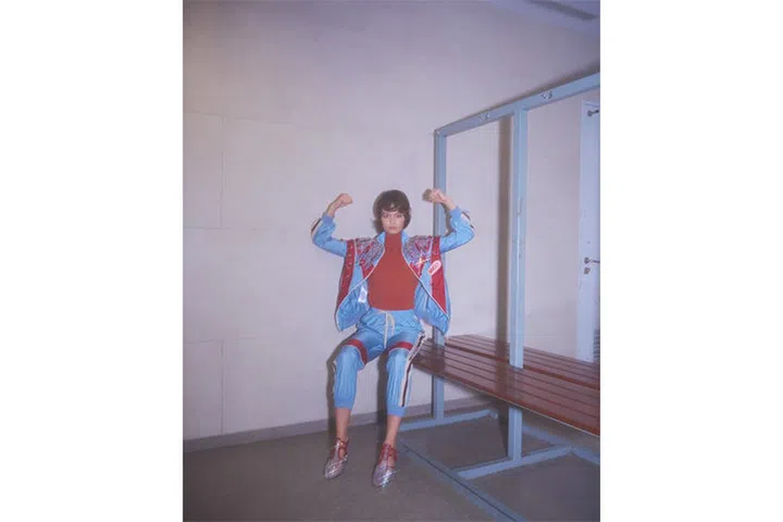 Nylon tracksuit with crystals, and leather T-bar pumps with crystals, Gucci. Cotton turteneck top, Cos.