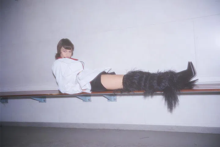 Calfskin jacket, Celine. Wool cardigan and leather belt, Gucci. Cotton shorts, Prada. Saint Laurent by Anthony Vaccarello velvet boots with ostrich feathers, Saint Laurent.