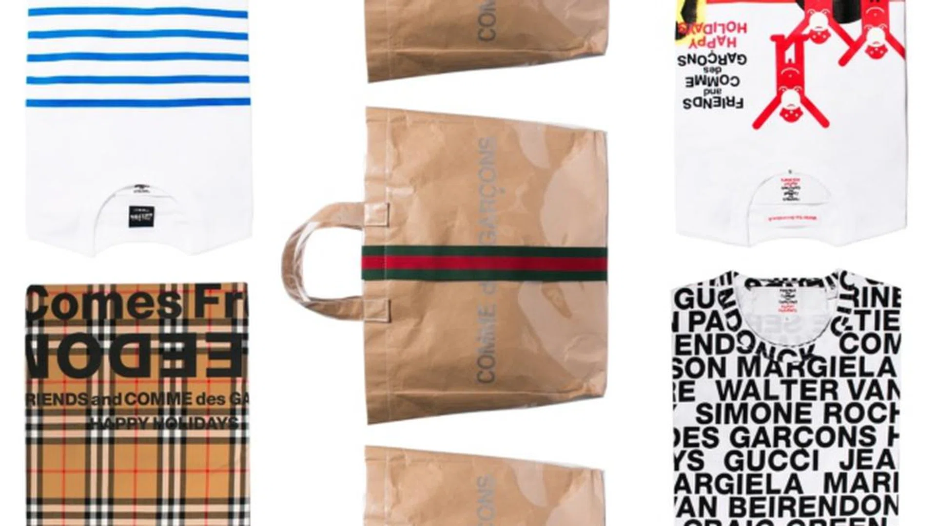 That's Burberry, Craig Green, Gucci, Maison Margiela, Jean Paul Gaultier, Marine Serre, Simone Rocha, Stussy and Walter Van Beirendonck lending their modus operandi to one garment or accessory each — with the final piece being a friends and CDG T-shirt. Instantly recognisable iconography, logos and tropes of the aforementioned brands cameo in the holiday release, and there's really no points for guessing what's what; Burberry's check, Gucci's green and red stripe, Simone Rocha's bow and Marine Serre's crescent motif are distinctive, amongst others. CDG's Adrian Joffe asserts that this marks Maison Margiela's first ever collaboration with another brand, tipping the specific piece as a serious collectible.